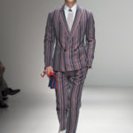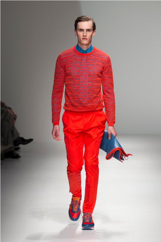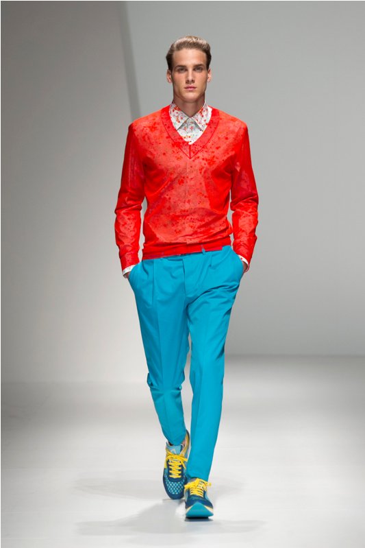 L’uomo Ferragamo della p/e 2013 o è un uomo giovane che quindi si veste secondo l’impulso del momento e tralascia le regole del ben vestire e porta sneackers colorate o meglio multicolor ai piedi come i giovanissimi, o è un eccentrico e per tale caratteristica richiama l’attenzione, oppure è un artista che usa i colori sull’abito allo stesso modo che sulla tela. Dobbiamo riconoscere che c’è un interessante studio dei colori da parte di Massimiliano Giornetti a cui tra l’altro assegna nomi molto puntuali per designarli: gli azzurri e verdi sono pacific, curaçao, spermint, pastel blu e pastel green; i rossi e i gialli sono granatina, pink pepper , summer sun e il nostrano limoncello; non manca il bianco ottico, e i neutri perla e corda.