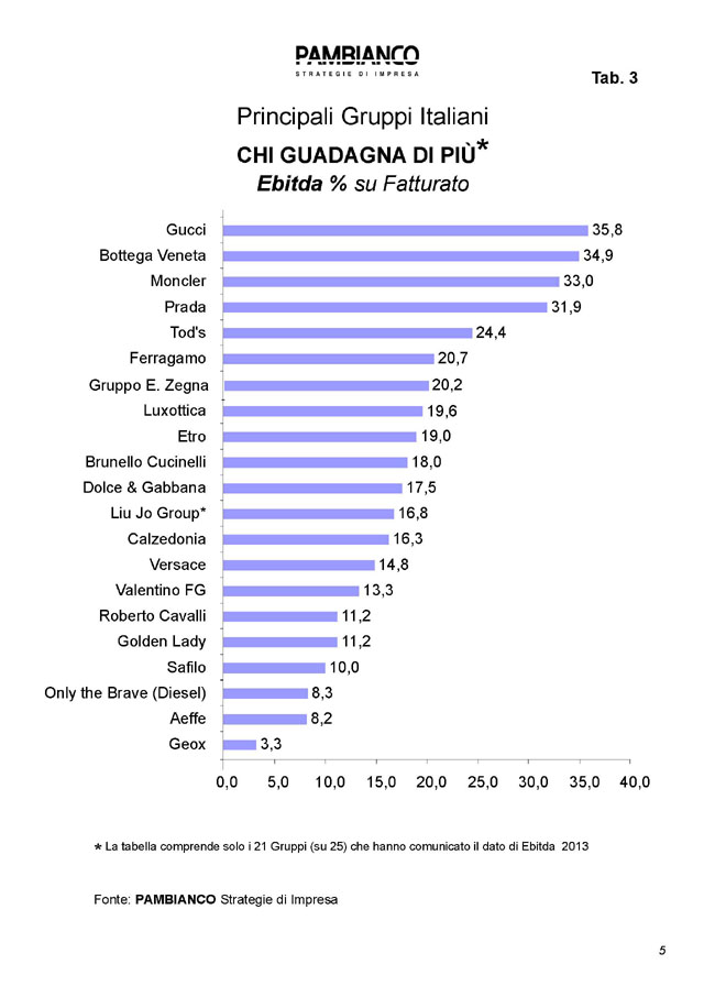 Per quanto concerne la redditività, Pambianco ha evidenziato che i risultati più brillanti sono stati quelli di Bottega Veneta con un margine ebitda al 34,4%, Gucci con il 34,3% e Moncler con il 33,5%.