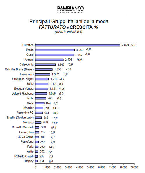 Luxottica si conferma al primo posto con 7,699 miliardi di ricavi, in aumento del 5,3%, seguita gruppo Prada con 3,552 miliardi, in calo dell’1,%. Va precisato però che non è del tutto congruo confrontare direttamente il colosso di Leonardo Del Vecchio, iperspecializzato nell’occhialeria, con il gruppo guidato da Miuccia Prada e Patrizio Bertelli, il cui core business è rappresentato da accessori e abbigliamento (grazie ai quattro marchi del portafoglio: Prada, Miu Miu, Church’s e Car Shoe). Al terzo posto si attesta Gucci (considerando il solo marchio della doppia G) con 3,497 miliardi di fatturato, in discesa dell’1,8%. In termini di tassi di crescita si sono distinti, nell’ordine, Valentino FG (20,3%), Moncler (19,6%) e Versace (16,9%).