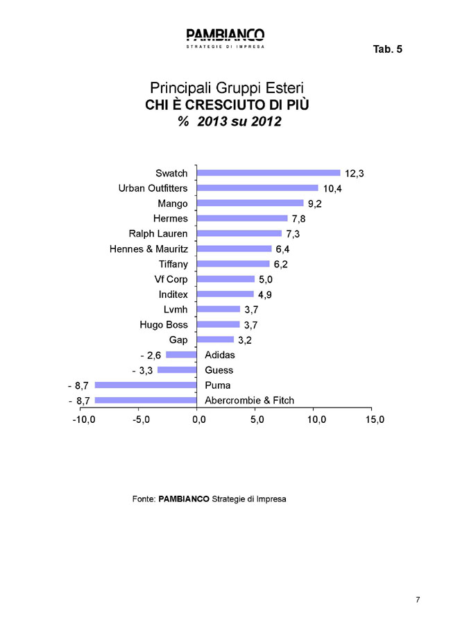 Anche i risultati di fatturato dei gruppi esteri presi in esame sono apparsi simili a quelli registrati dagli italiani, aumentando complessivamente del 5,7% e passando da 133.678 a 141.357 mln di euro. Sul podio sono saliti rispettivamente H&M (+17,8%), Hermès (9,7%) e Mango (9,3%). Tra le holding straniere con i risultati più brillanti si sono imposte Swatch con un ebitda del 24,2%, seguita da LVMH (23,9% sul fatturato) e Hugo Boss (23%).