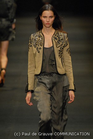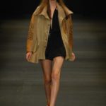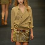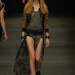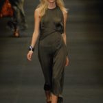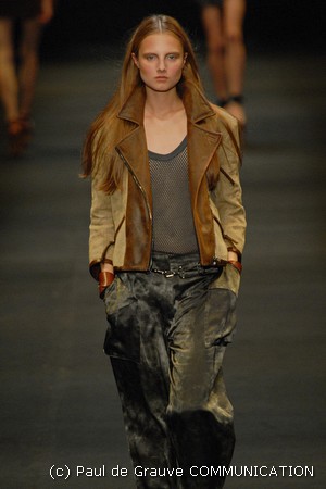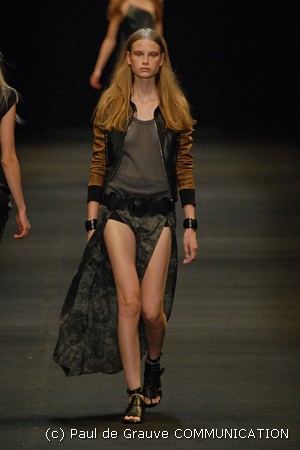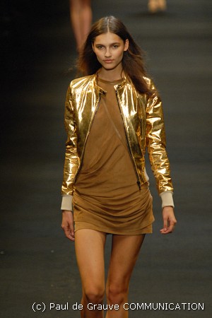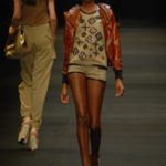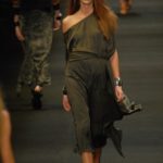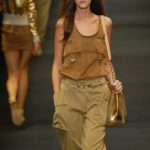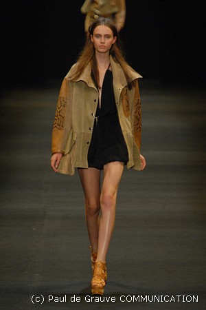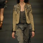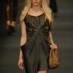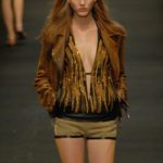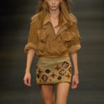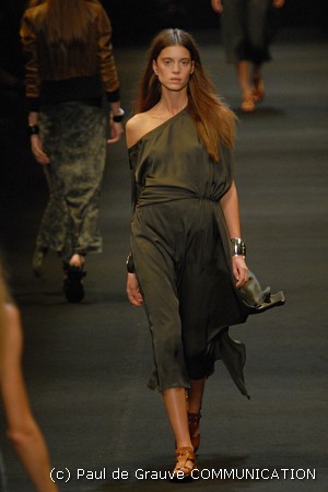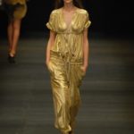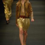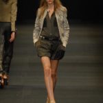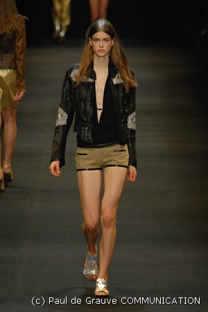 Le giacche in camoscio oversize le ritroviamo nei toni più chiari del beige e dell’ocra, per arrivare alla tonalità più decisa del marrone. Sandali flat e alte zeppe in legno funzionano come valide alternative per i diversi look. Gli ultimi modelli a sfilare in passerella propongono chiodi in pelle invecchiata, marrone o nera, impreziositi da inserti in paillettes dorate e abbinati a top sempre in pelle dalle profonde scollature, su shorts quasi inguinali. Belli i lunghi abiti mono spalla in seta scivolata dal grigio intenso, proposti sia lunghi alla caviglia sia drappeggiati, per un effetto dal sapore molto mediterraneo.
