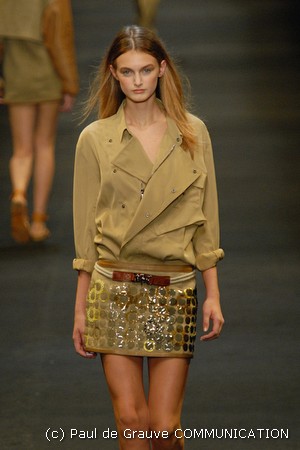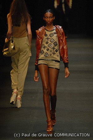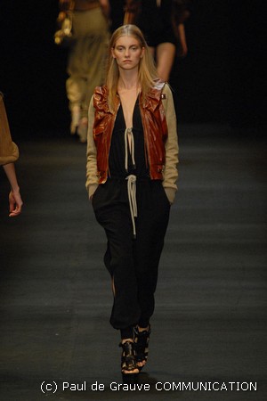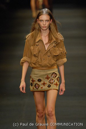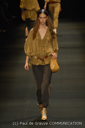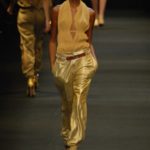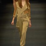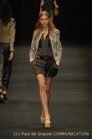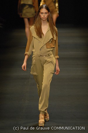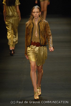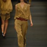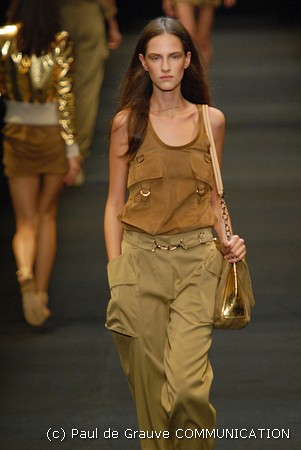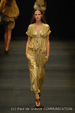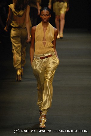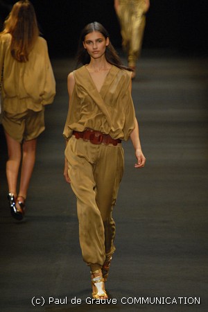 I colori predominanti sono i chiari, dal beige all’ocra al grigio perla, con saltuari accenti brown o neri. I tessuti utilizzati vanno dalla seta, al suede alla pelle, costantemente arricchiti da particolari in paillettes o in pitone. Ai larghi pantaloni scivolati, stretti alla caviglia, si alternano succinti shorts profilati in pelle e le morbide tute in seta, lunghe o corte, fanno un po’ da cornice all’intera collezione.