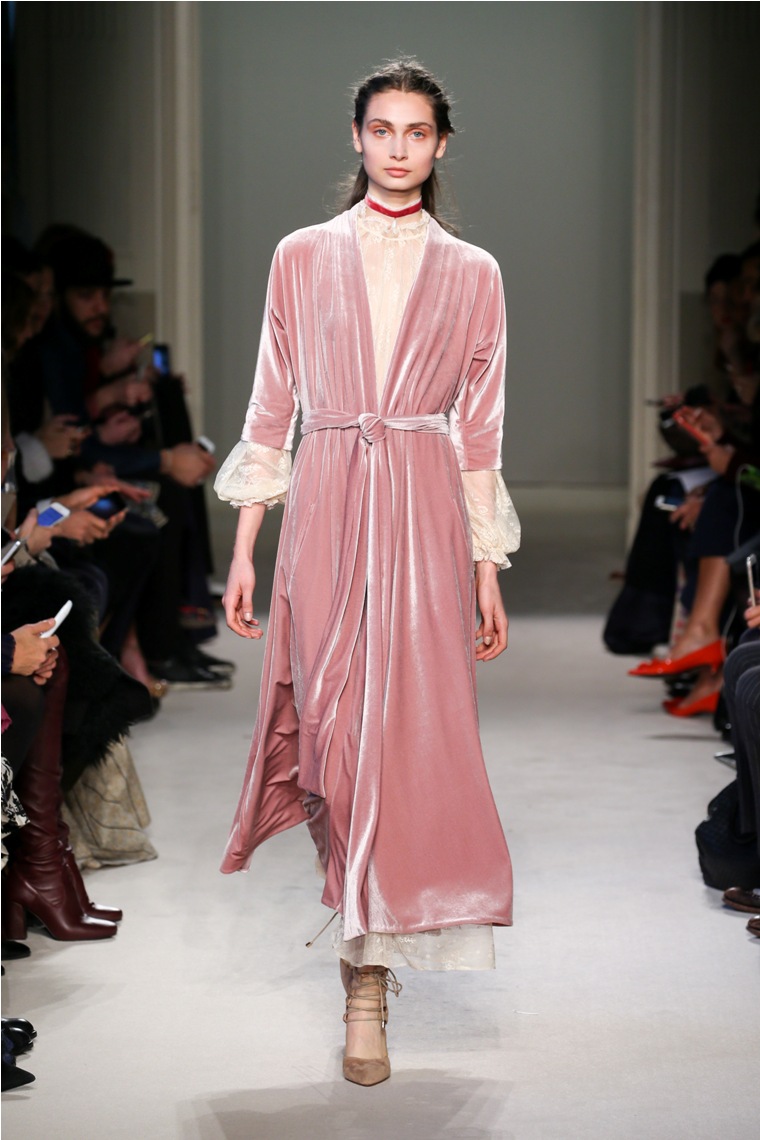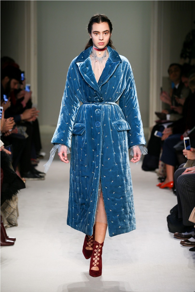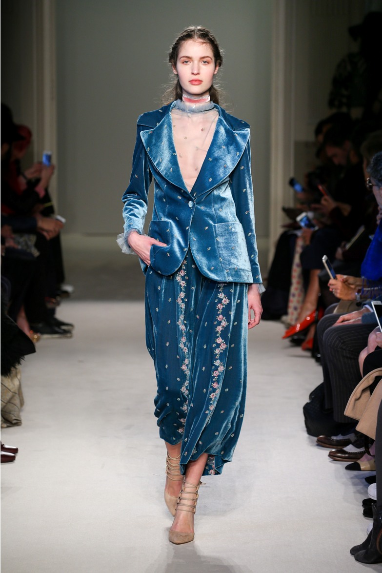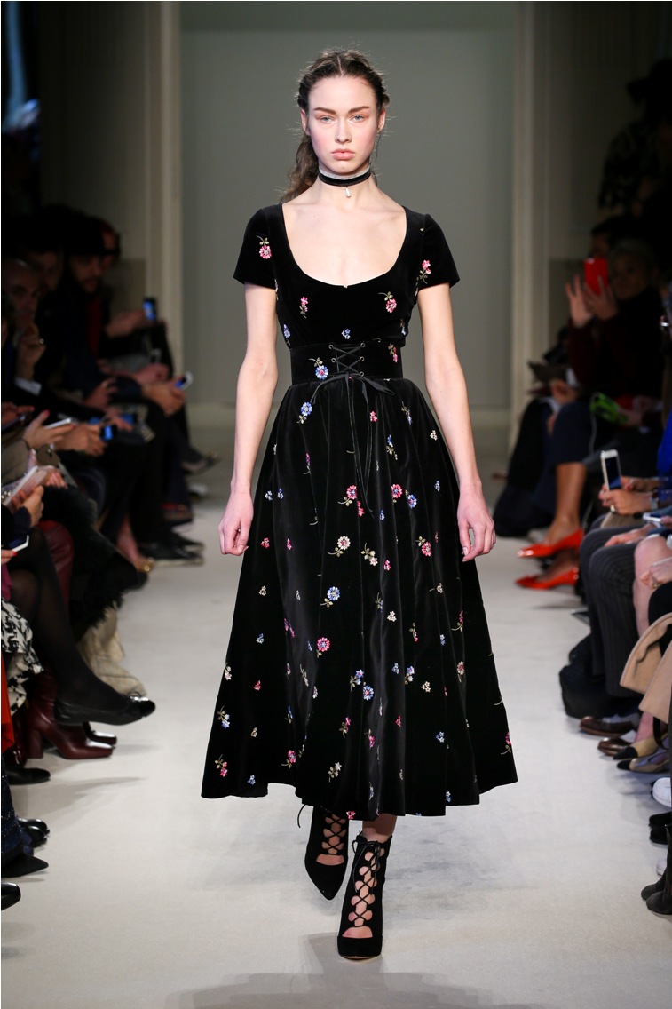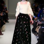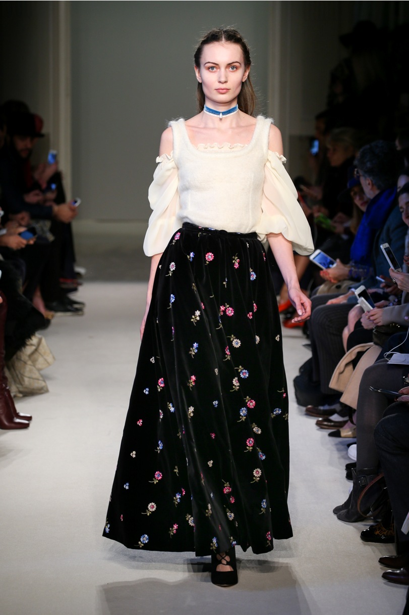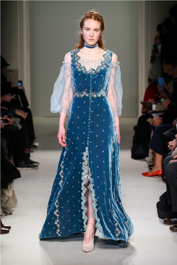 Difficile restare indifferenti di fronte a quei velluti -offerti a profusione trasversalmente a tutto-, a quei ricami -ricorrenti su abiti, maglie, corpetti, gonne-, a quei volumi -leggeri come piume e soffici come nuvole-.