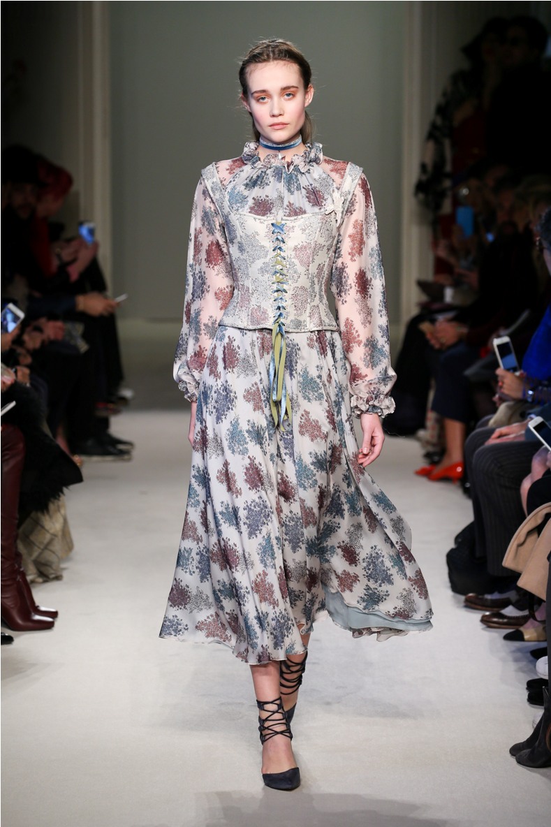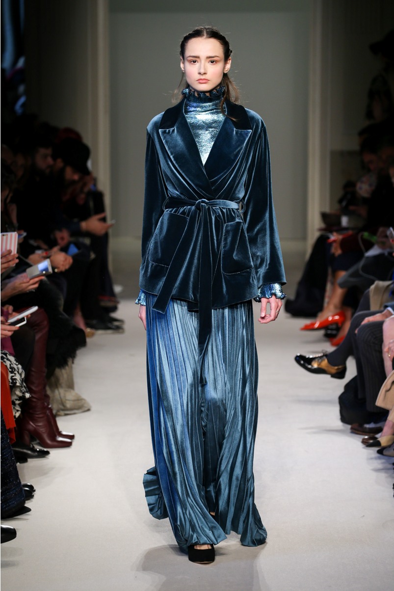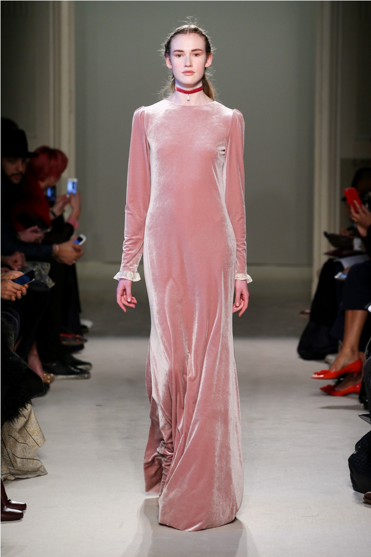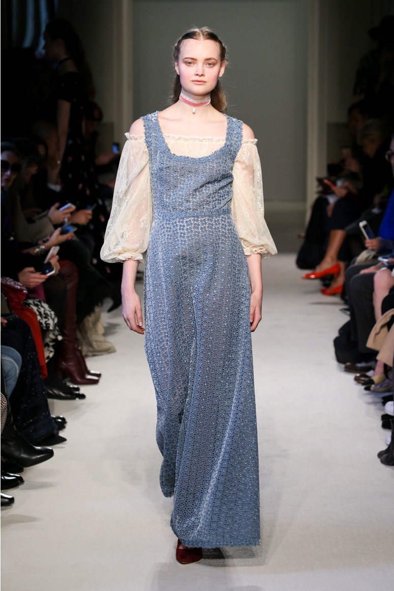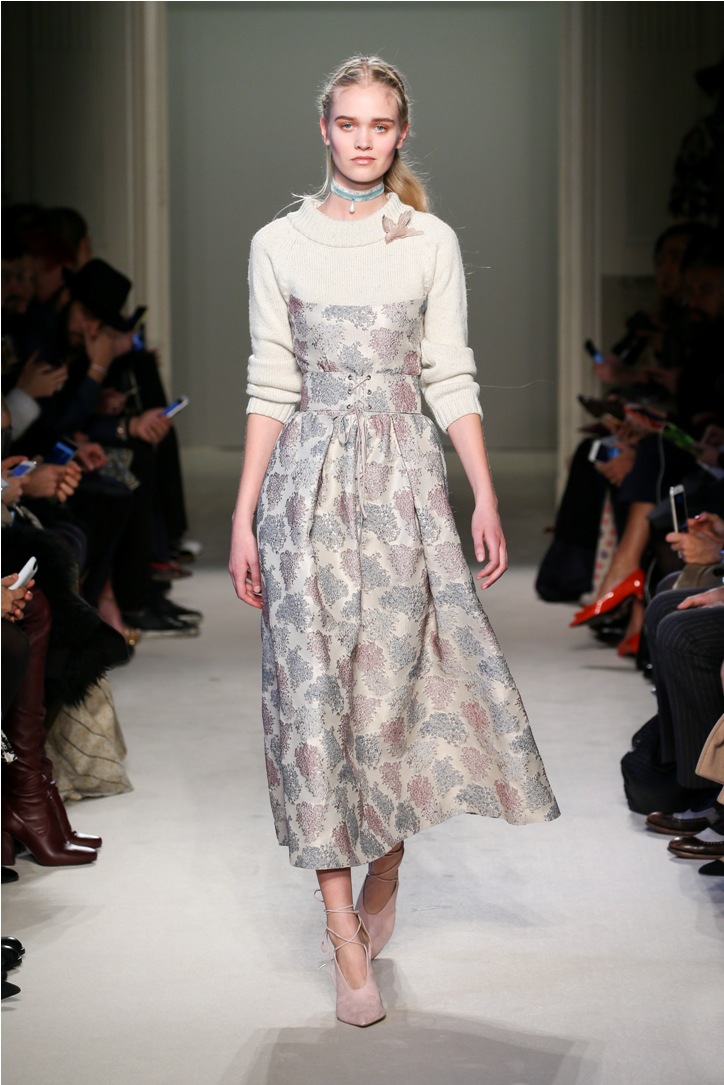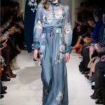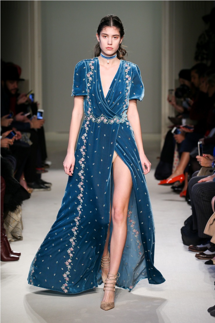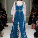 Difficile restare indifferenti di fronte a quei velluti -offerti a profusione trasversalmente a tutto-, a quei ricami -ricorrenti su abiti, maglie, corpetti, gonne-, a quei volumi -leggeri come piume e soffici come nuvole-.