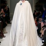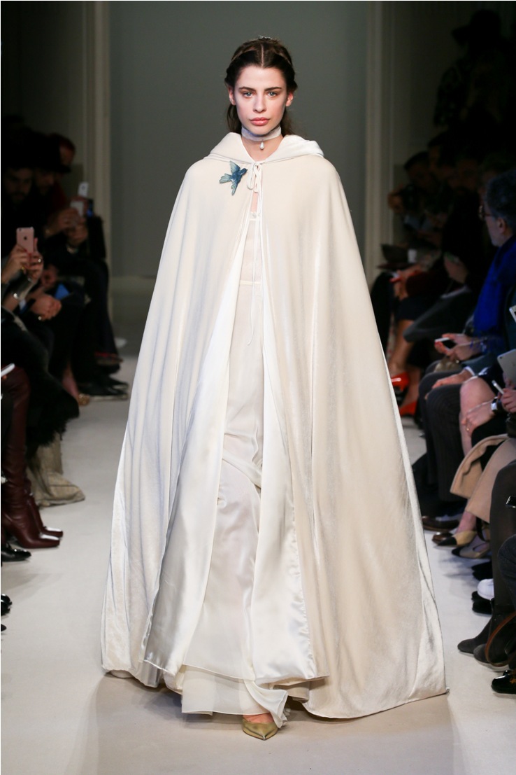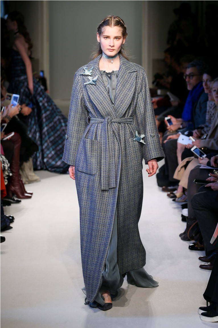Spille raffiguranti volatili dalle ali distese -simbolo forse di un sogno liberato- impreziosiscono baveri e cinture, lavorazioni a sangallo spuntano dalle maniche e dagli orli dei lunghi cappotti a vestaglia.
