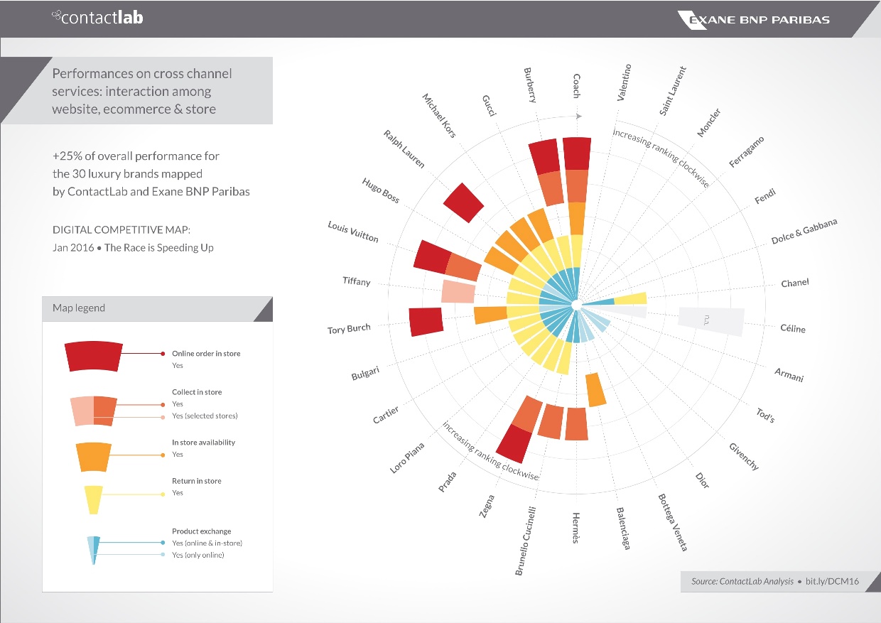L’edizione 2015 della Digital Competitive Map – The race is speeding up di Contact Lab ed Exane BNP Paribas, che monitora il grado di multicanalità e digitalizzazione dell’offerta di trenta marchi internazionali di moda e lusso, ha evidenziato che oggi la crescita del business passa anche e soprattutto attraverso l’online (inteso non solo come vendita, ma pure come consulenza di stile personalizzata fornita tramite chat, telefono o e-mail).