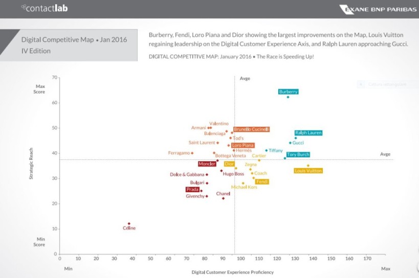 Nella nuova Digital Competitive Map è ancora l’inglese Burberry a fare la parte del leone distanziando di gran lunga i concorrenti; comunque, brand quali Fendi, Loro Piana (entrambi nello “squadrone” di LVMH) e Dior hanno compiuto significativi progressi. Specialmente LV appare leader sul fronte della Digital Customer Experience, mentre Ralph Lauren e Gucci si profilano sempre più brillanti nella dimensione digitale.