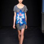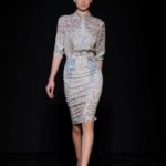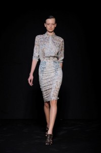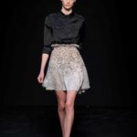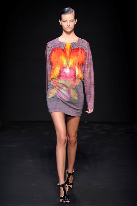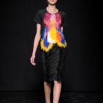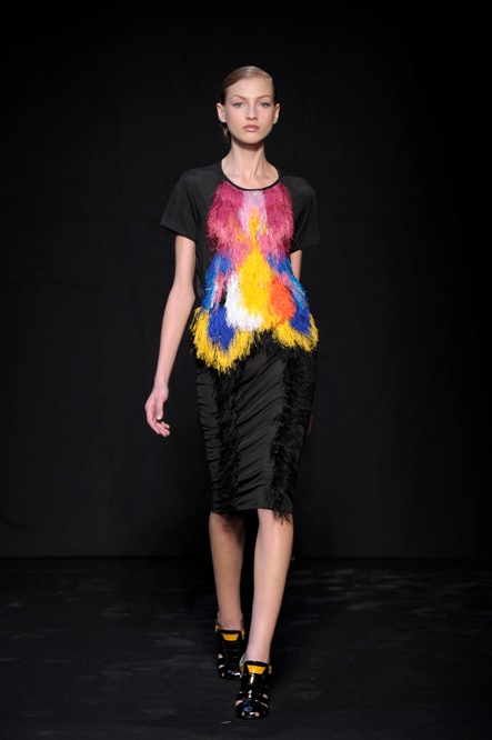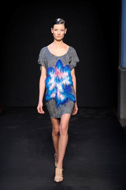 Belli gli ultimi abiti a sfilare in passerella: sete scivolate per una stampa dal sapore molto grafico in bianco e nero sfumato, con applicazioni in strass e frange dalle tonalità psichedeliche.