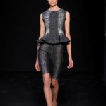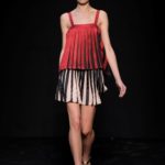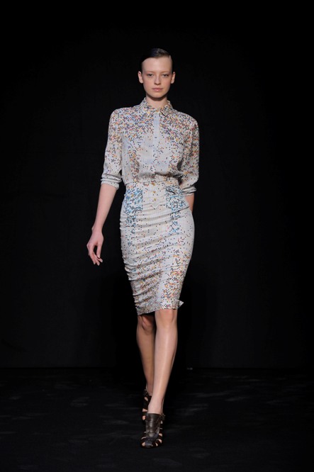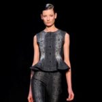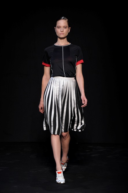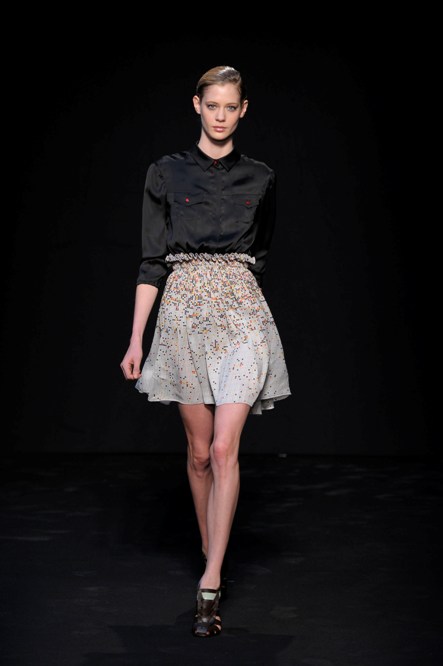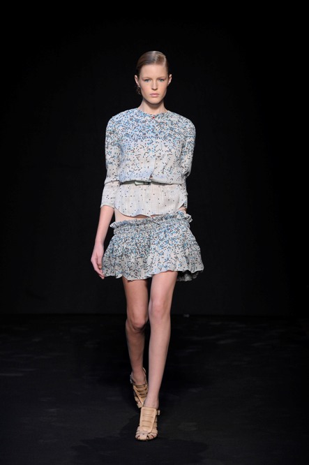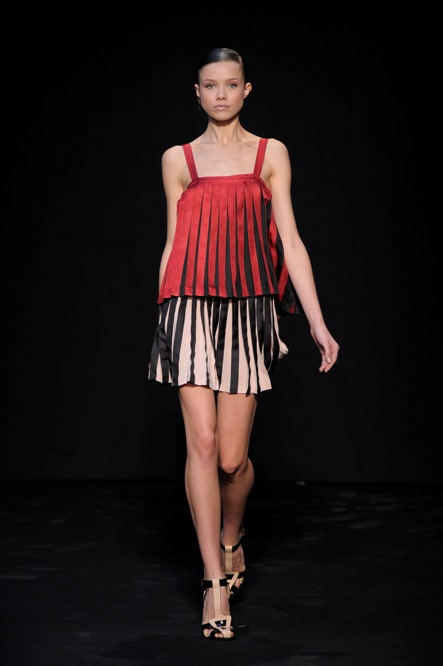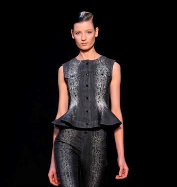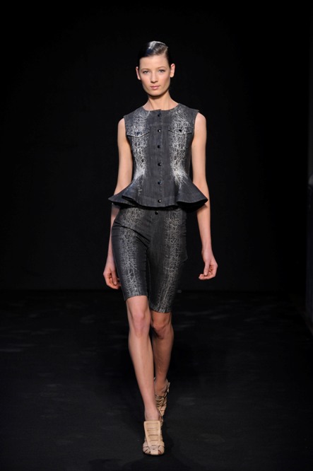 I primi modelli a sfilare in passerella proponevano un completo bermuda e gilet in jeans dal nero opaco, che avvolgeva la silhouette in maniera decisamente costretta, anche a causa della vita alta che mal si abbinava alla lunghezza al di sopra del ginocchio dei pantaloni. Il gilet era tempestato di strass sulla parte anteriore e finiva in una serie di balze appoggiate ai fianchi. Lo stesso look è stato poi riproposto in tessuto stretch rosso intenso a metà della sfilata.