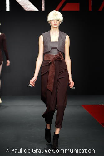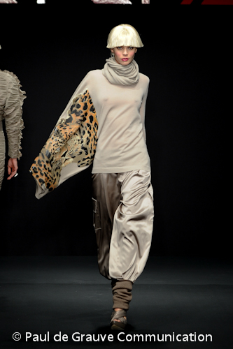 Dall’alto dei suoi tacchi 16, per stivali, tronchetti e sandali, la donna di Krizia ha anche un animale portafortuna, il giaguaro, che si affaccia su una delle ampie maniche asimmetriche in cachemire.