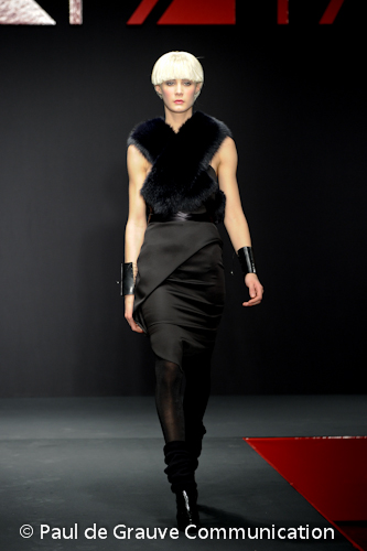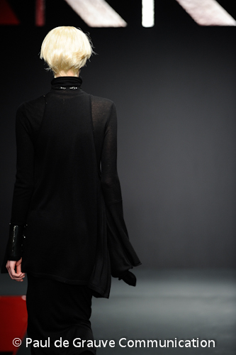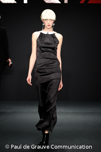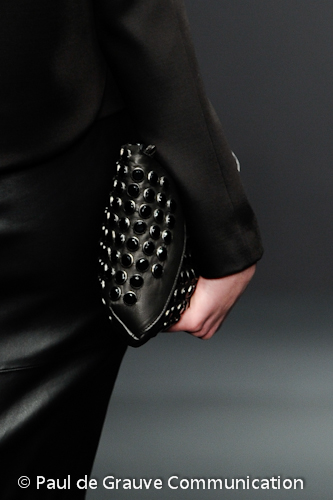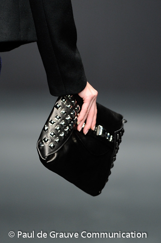 Interessanti i sottili cravattini in maglia e i micro-colletti, che scendono ad incorniciare una scollatura vertiginosa sul dorso di un abito nero.