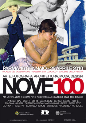 Mentre a Roma i promotori del Progetto “Archivi della Moda del “˜900” (Direzione Generale Archivi, Soprintendenza Archivistica per il Lazio e Associazione Nazionale Archivistica Italiana) mirano a valorizzare l’immenso patrimonio della moda italiana conservato nei documenti del secolo scorso, per restituire alla capitale un ruolo fondamentale nel recupero della memoria di “città aperta” allo sviluppo della moda, a Parma è in corso fino al 25 Aprile la mostra “Nove100 – Arte, Fotografia, Architettura, Moda, Design”, che per la prima volta espone la formidabile collezione dello CSAC (Centro Studi e Archivio della Comunicazione dell’Università di Parma).