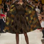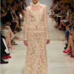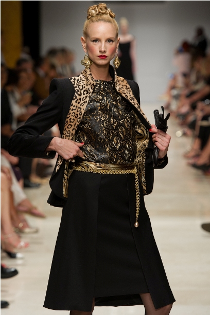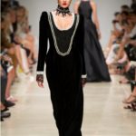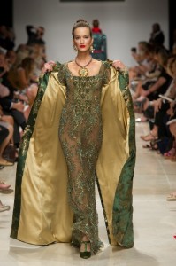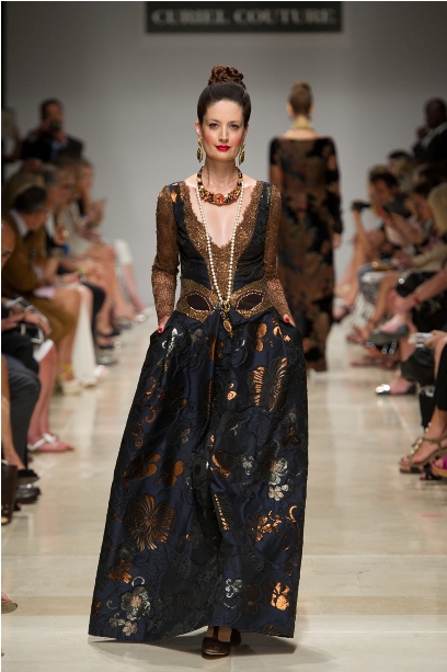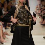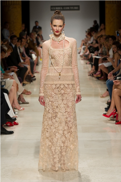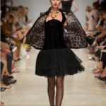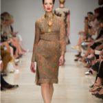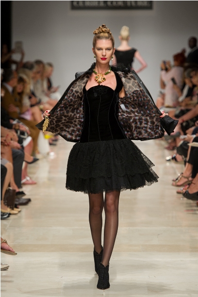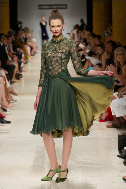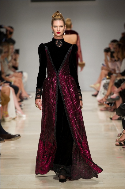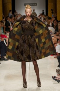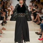 Per la sera, abiti dalle piene cromie rinascimentali, corpetti sormontati da ampie gonne in perfetto stile castellano, o abiti dalle linee dritte interamente realizzati in pizzo e impreziositi da ricchi ricami. Interessante l’abito in velluto rosso scarlatto con maniche in nuances in pizzo e ampia scollatura che riporta alla mente la controversa figura di Lucrezia Borgia. A corredo delle mises serali hanno sfilato preziosi mantelli damascati lunghi fino a sfiorare il pavimento.
