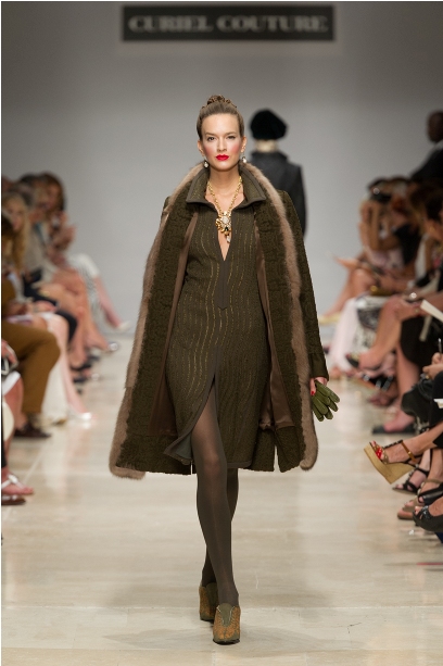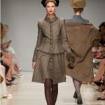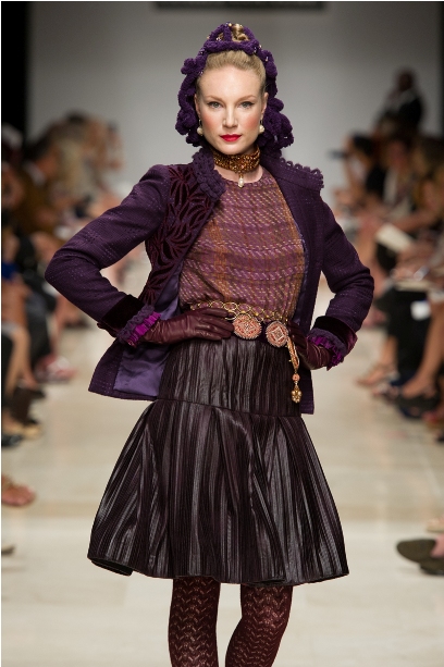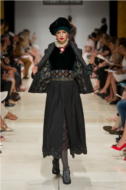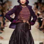 Tailleur in stile anni 40’ con gonne prevalentemente a godé abbinate a giacche avvitate, sovente a redingote, corredati in nuances da polsini in pizzo o in pelliccia , guanti, calze, e delicatissime quanto colorate, calzature in seta ricamata, rivisitazioni di splendide antiche pantofole con tacco a rocchetto. Completano l’ensemble baschi di velluto in seta con ricami in oro, che conferiscono un’allure di fascinoso mistero, ma anche meravigliose reti per capelli. Splendida quella in ciniglia viola.