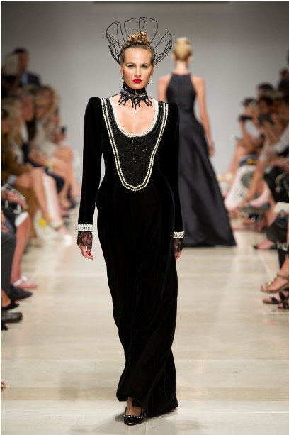 La collezione, è ispirata alla dinastia dei Tudors, regnante nell’epoca d’oro del pieno rinascimento Inglese. Epoca di grande fermento culturale, epoca di poeti e pensatori come Spenser e Marlowe, epoca in cui dipinti, melodie, rime e sonetti furono fonti di malia per esteti e anime pure. Epoca della regina Elisabetta prima, virgo imperialis, sensibile ai dettami della moda che trasse dall’arte l’ ispirazione per orientarsi tra le più sublimi maestrie sartoriali del tempo.