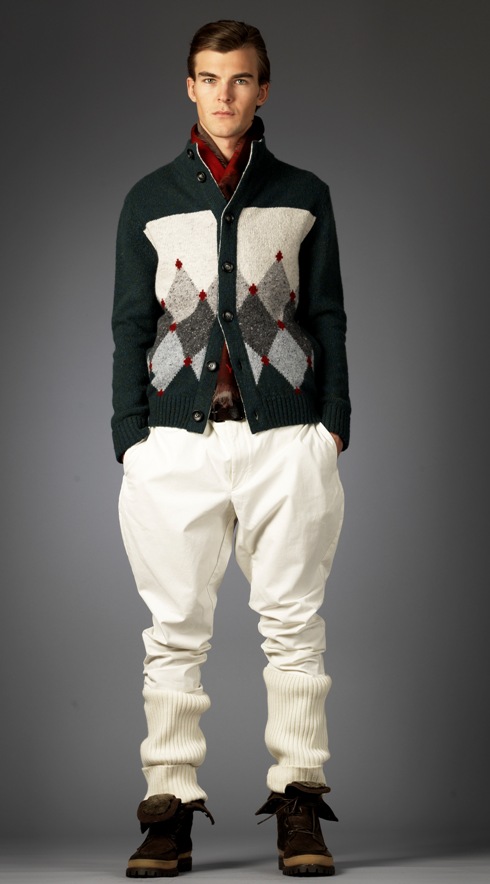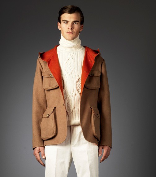 Con il secondo gruppo di capi entriamo nell’epoca d’oro delle esplorazioni navali alla scoperta delle terre artiche. Tradizione di qualcosa che sopravvive alle tempeste e alle lunghe traversate, metafora di un tempo intramontabile e che supera le distanze. Tutto è all’insegna di capi in grado di contrastare il grande freddo. Decisamente in evidenza il cardigan, in particolare il tradizionale “diamond cardigan” rivisitato e svecchiato in quanto a lavorazione, dimensione e colore. Più corto e sfilato se abbinato a pantaloni, dal volume amplio nella parte superiore, che terminano con un grande bordo in maglia, ispirati alla figura del comandante John Ross nelle sue spedizioni tra i ghiacci. Più morbido e lungo quando è accostato ad un pantalone dalla linea stretta e con alti risvolti. Cammello, arancio e bianco a dare il via alle gamme di colore.