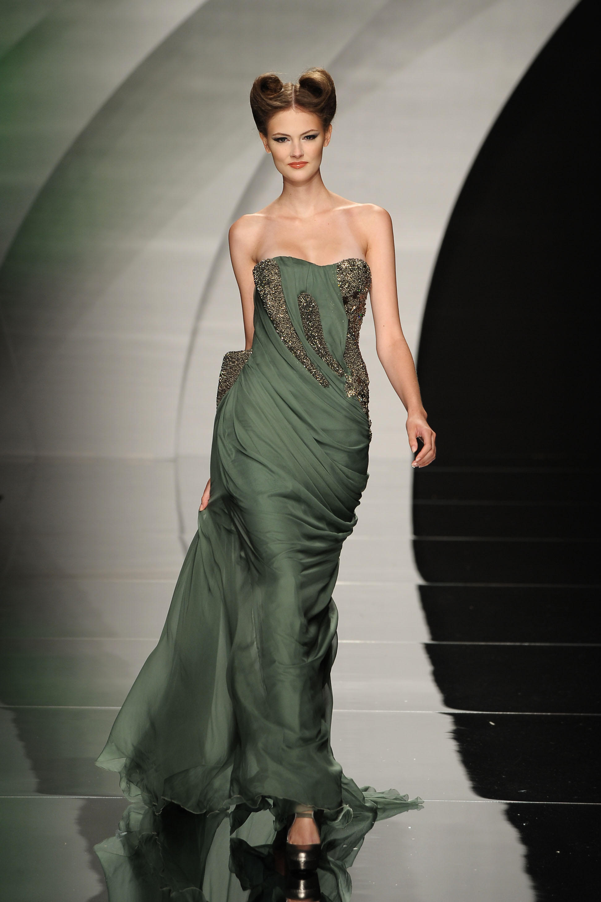 Lo stilista libanese Abed Mahfouz, ha presentato nell’ambito di AltaRomAltaModa, una collezione di haute couture ispirata all’Architettura Sperimentale; in passerella sfilano creazioni tridimensionali, abiti che evocano attraverso simmetrie e volumetrie complesse l’Opera House di Sydney. Mahfouz non rinuncia ai capisaldi delle sue proposte moda: ricami, pietre oro, cristalli a forma tubolare, ricoprono e decorano tessuti ricchi e nobili. Pizzi sovrapposti, crepe, mussola e organza, sono accostati alla novità di questa collezione, abiti interamente ricoperti di paillettes che producono un effetto luce, scintillante.
