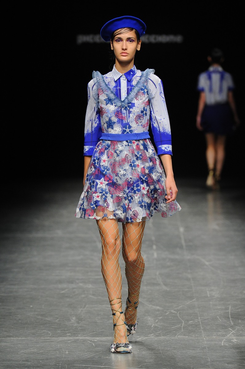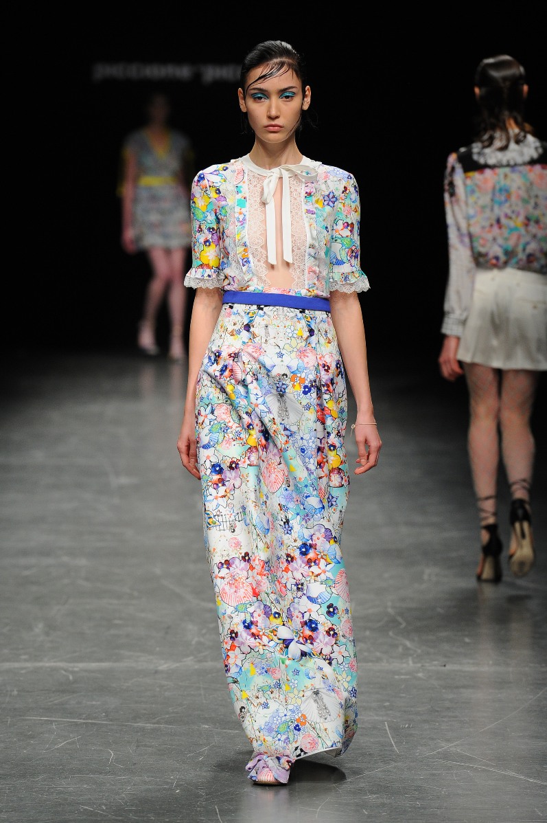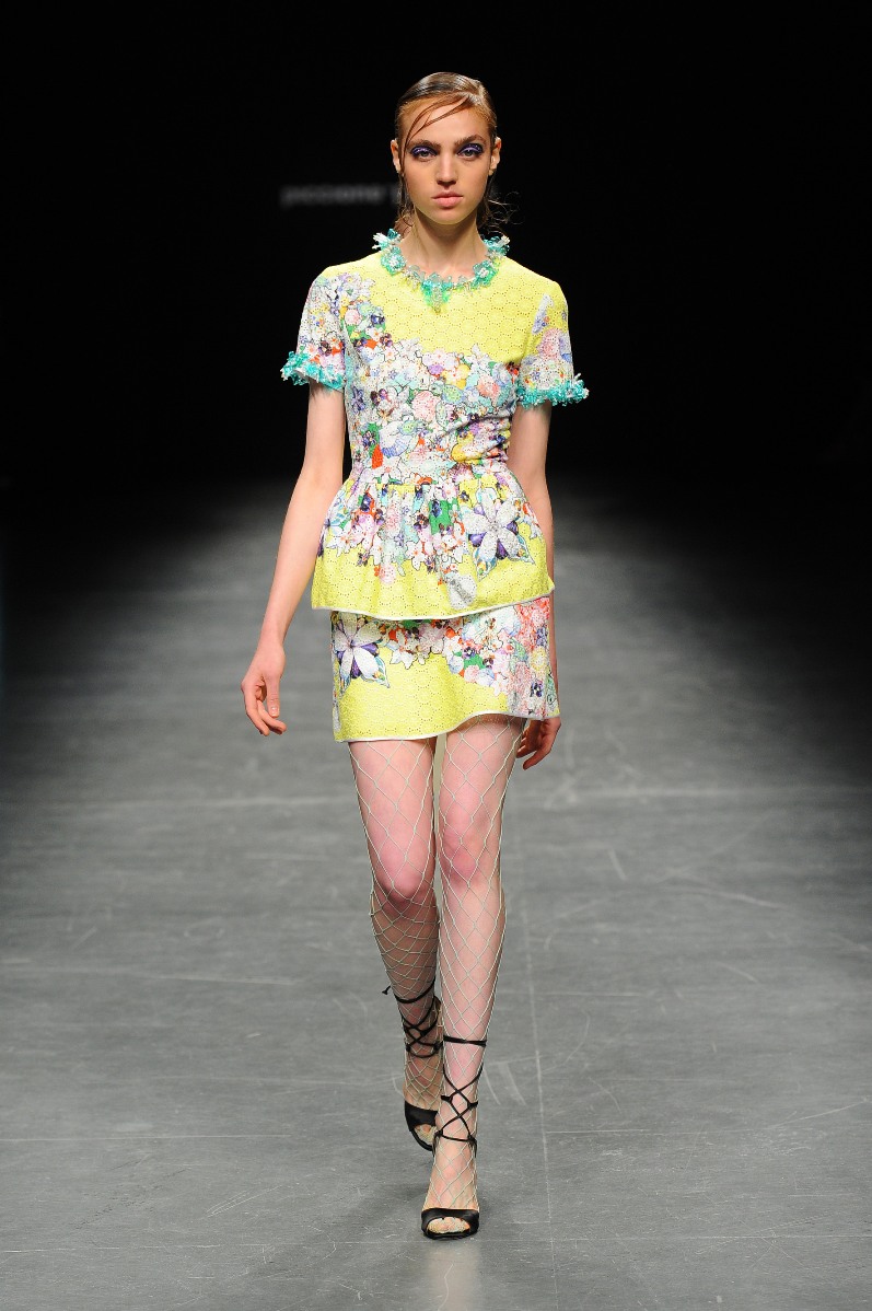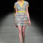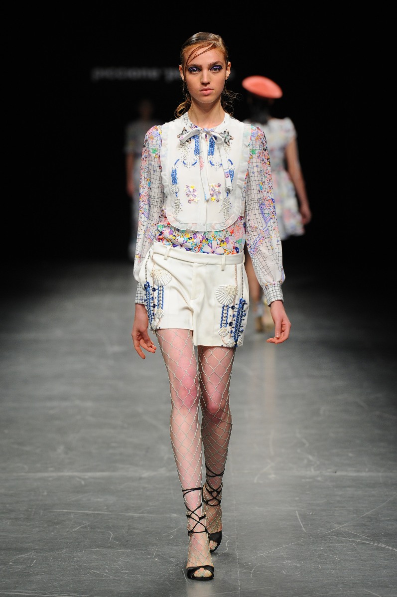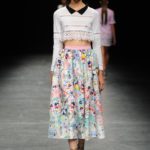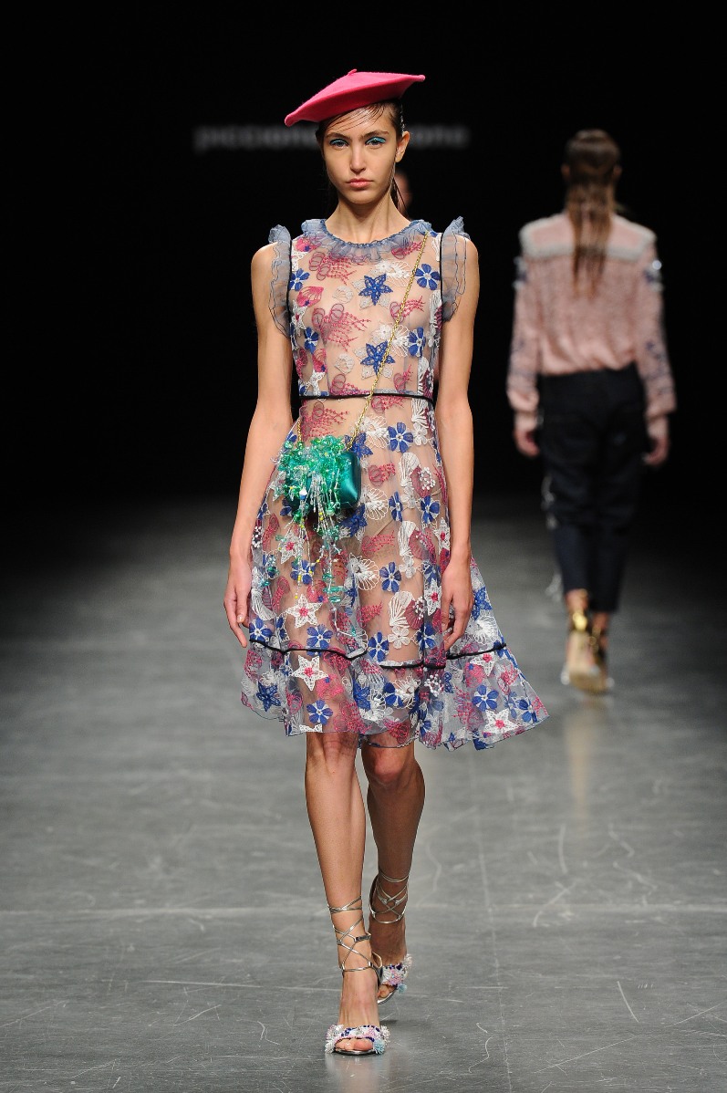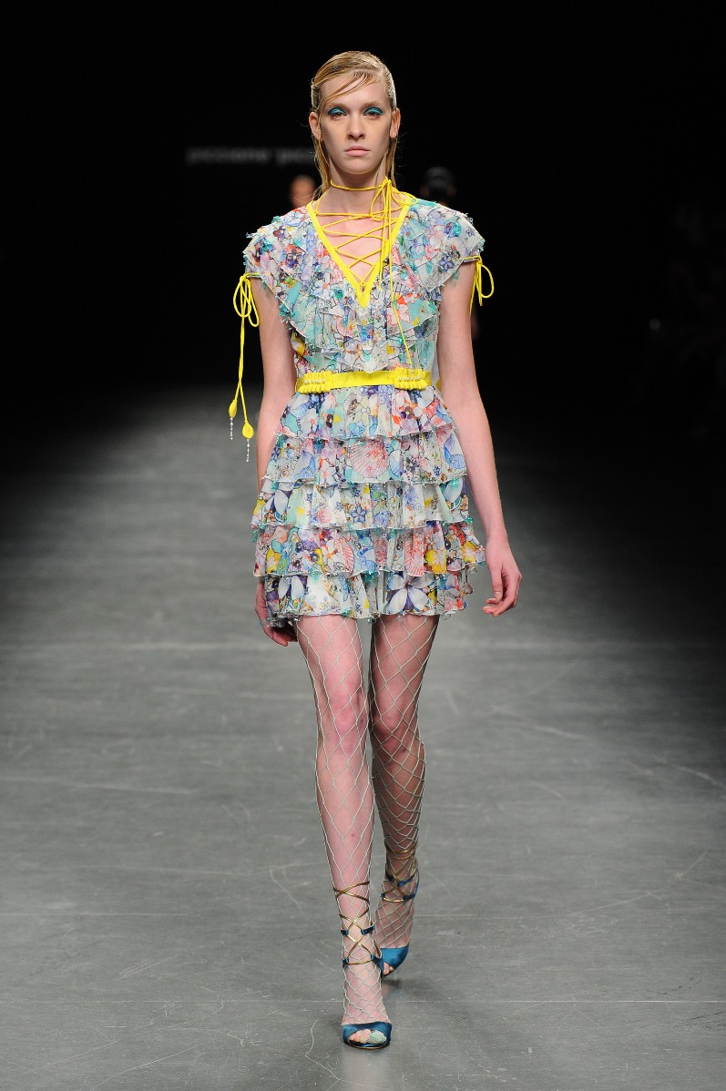 Molte le balze e molti i volant adagiati su morbide e ampie gonne su camicette dal carattere romantico. Divertono le calze a rete grande colorate così come i baschi multicolori e gli orecchini “mega” a corredo degli outfit presentati.
