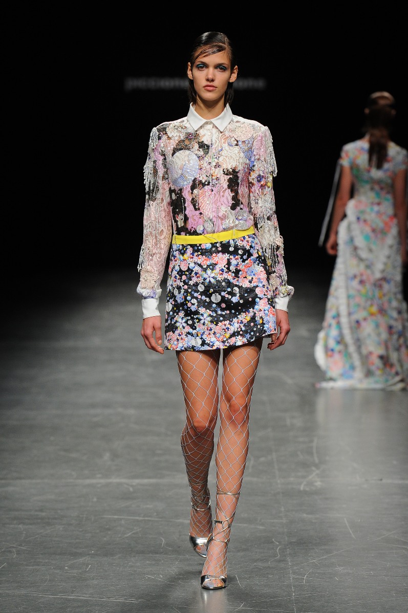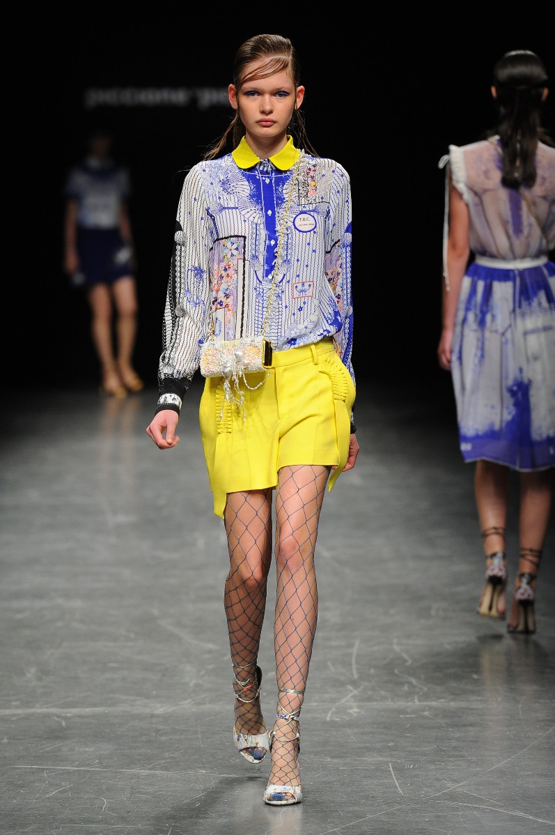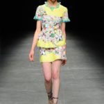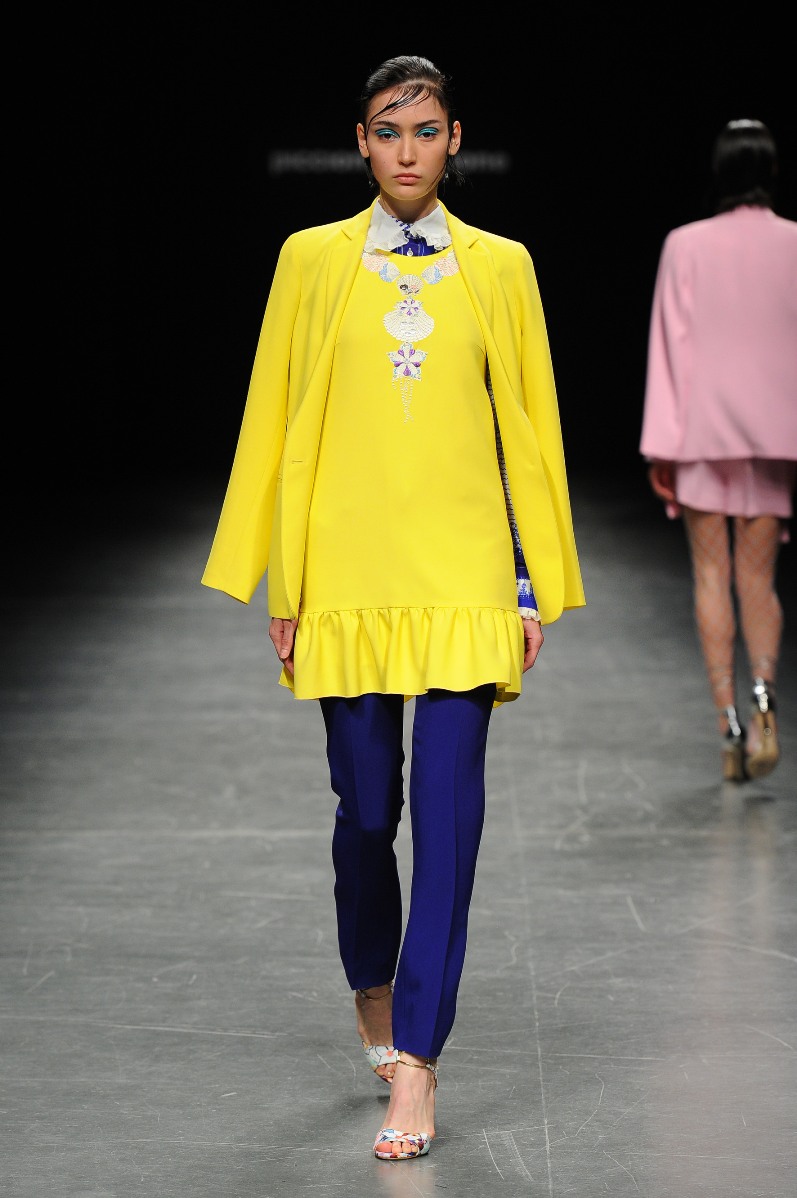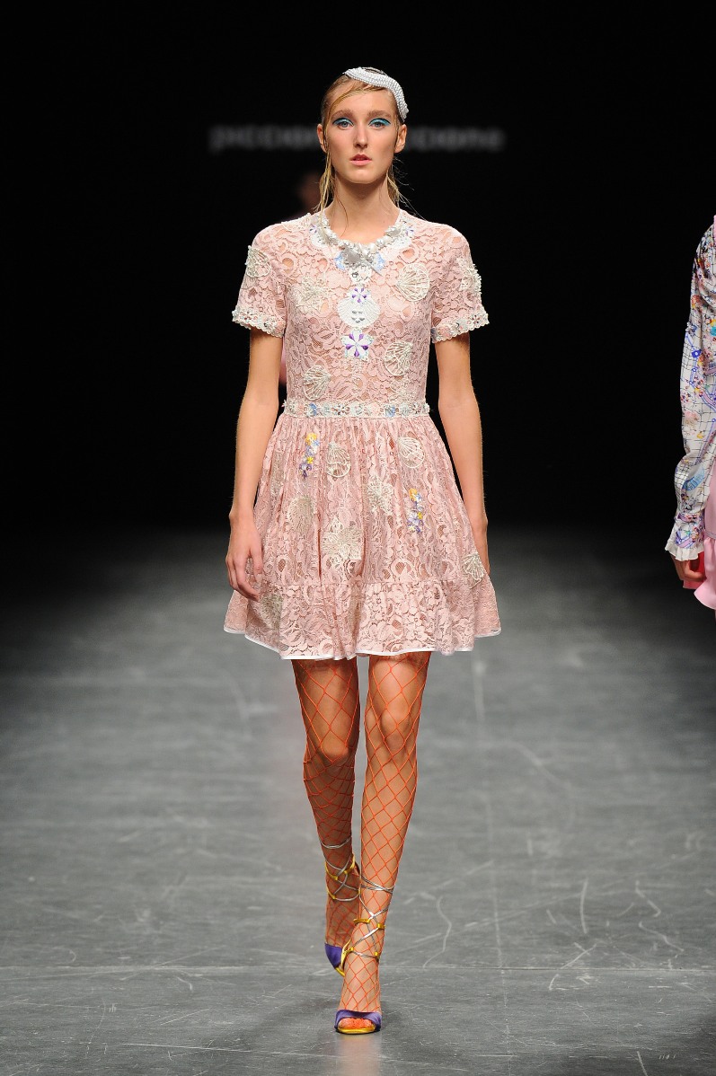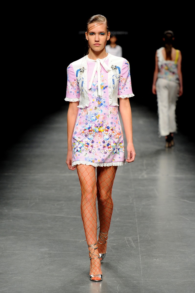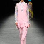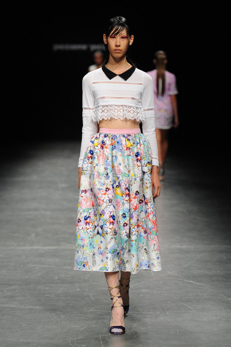 Molte le balze e molti i volant adagiati su morbide e ampie gonne su camicette dal carattere romantico. Divertono le calze a rete grande colorate così come i baschi multicolori e gli orecchini “mega” a corredo degli outfit presentati.