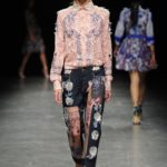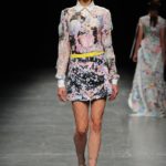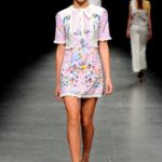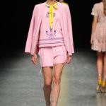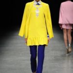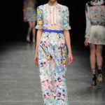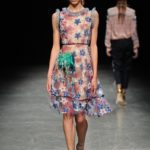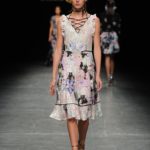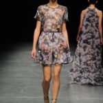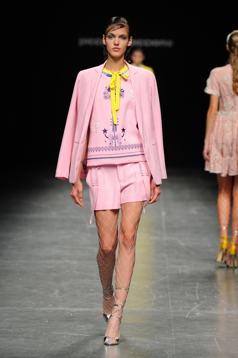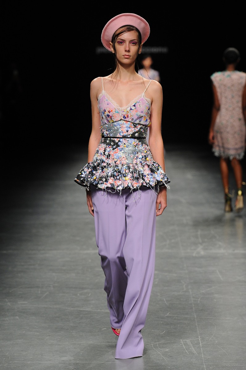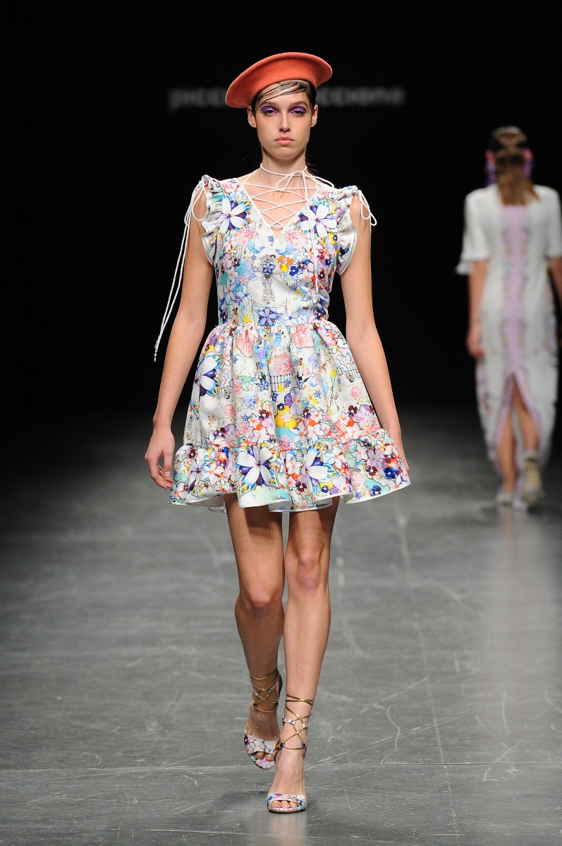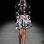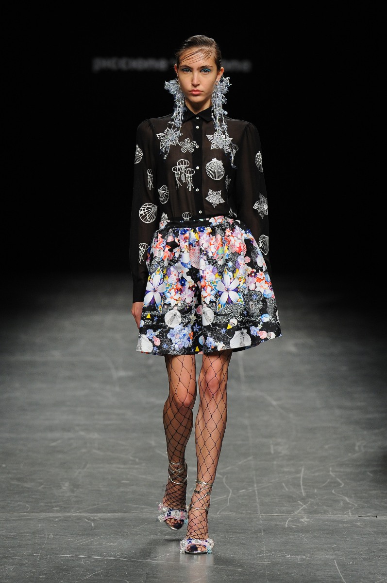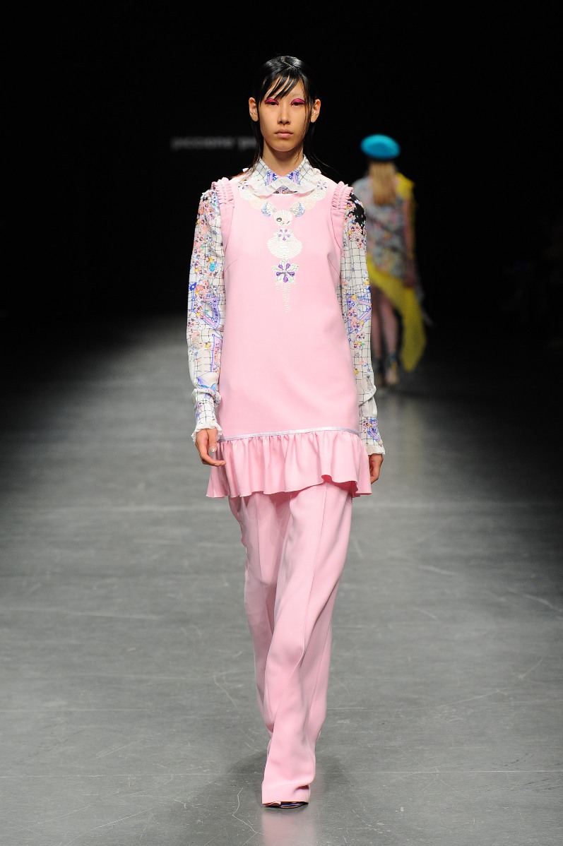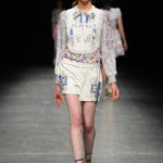 Molte le balze e molti i volant adagiati su morbide e ampie gonne su camicette dal carattere romantico. Divertono le calze a rete grande colorate così come i baschi multicolori e gli orecchini “mega” a corredo degli outfit presentati.