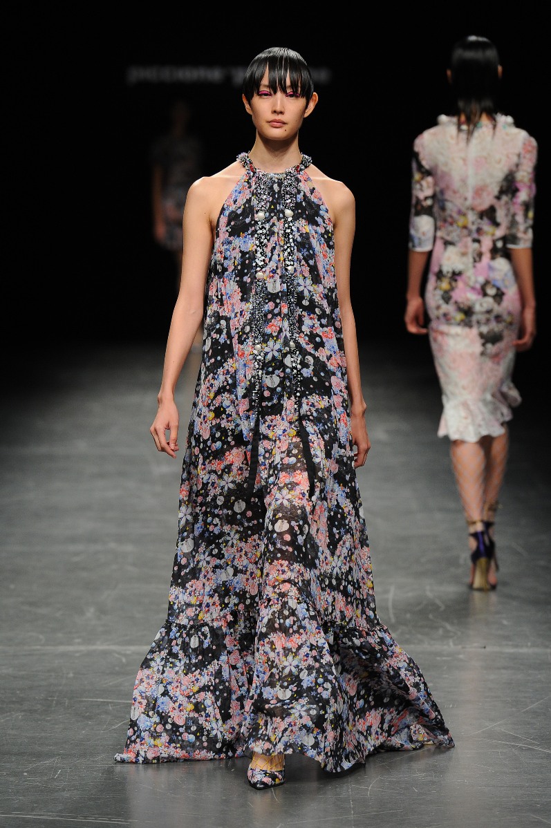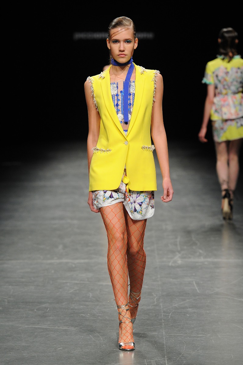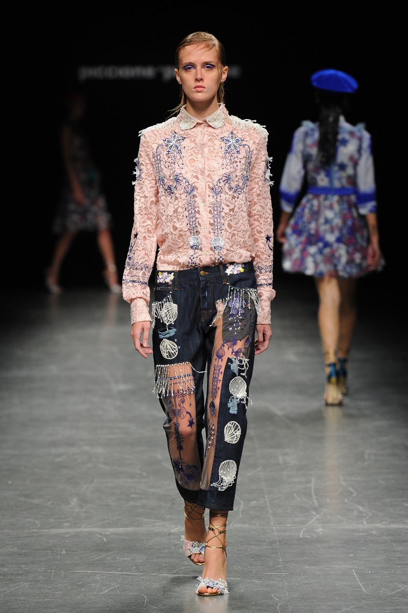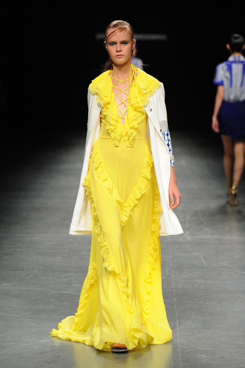 La proposta si dipana in una moltitudine di freschi toni estivi tra i quali spicca più di ogni altro il giallo limone, molte poi le sfumature di azzurri, malva, menta e rosa tenui. Fantasie digitali si posano sugli abiti delicati e romantici, fatti di tripudi di pizzo, arioso pizzo sangallo, sete preziose, e voile leggeri. Allegre e colorate, le stampe, presentano trionfi di fiori variopinti e straordinari paesaggi sottomarini, a sottendere per quest’ultimi, la lettura distaccata che si fa’ del mondo nel corso di una immersione e poi di una riemersione dalle acque.