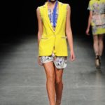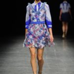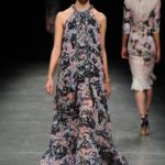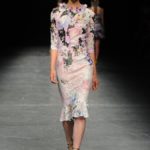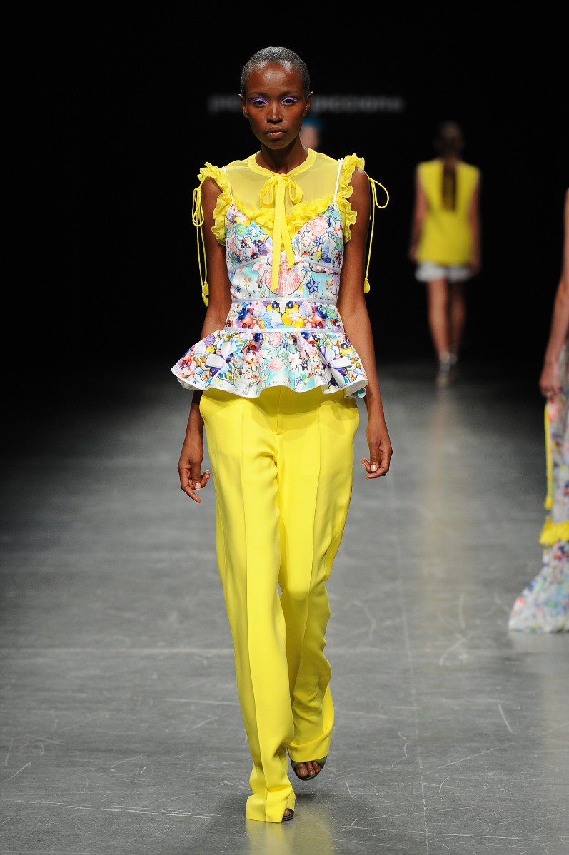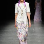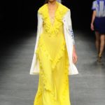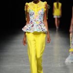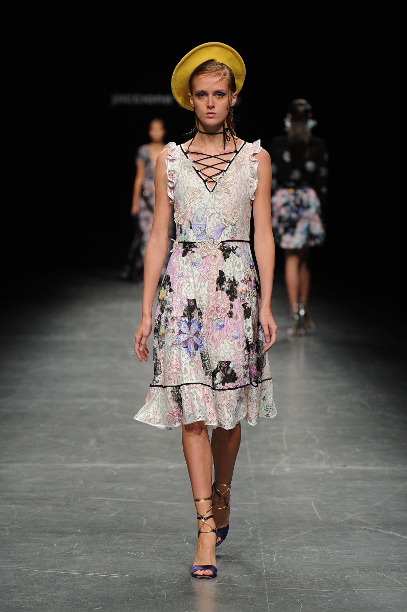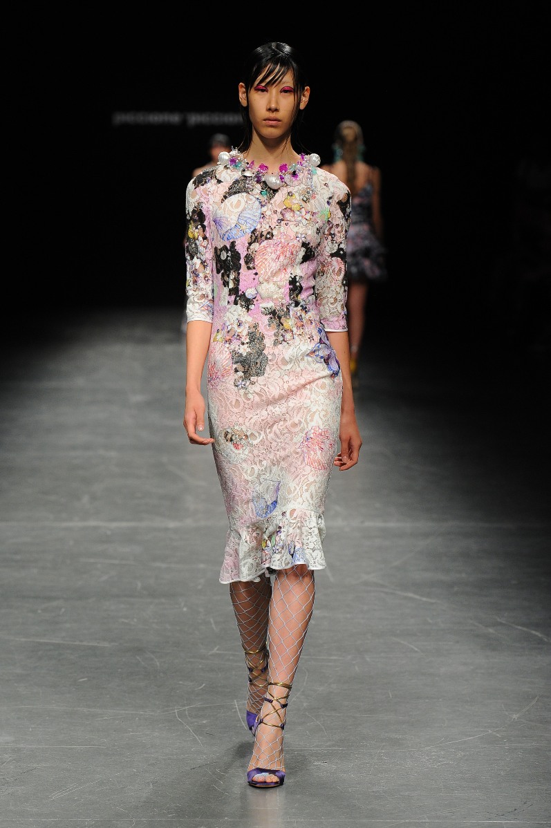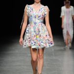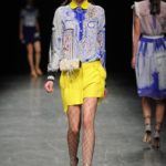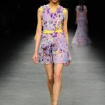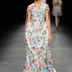 La proposta si dipana in una moltitudine di freschi toni estivi tra i quali spicca più di ogni altro il giallo limone, molte poi le sfumature di azzurri, malva, menta e rosa tenui. Fantasie digitali si posano sugli abiti delicati e romantici, fatti di tripudi di pizzo, arioso pizzo sangallo, sete preziose, e voile leggeri. Allegre e colorate, le stampe, presentano trionfi di fiori variopinti e straordinari paesaggi sottomarini, a sottendere per quest’ultimi, la lettura distaccata che si fa’ del mondo nel corso di una immersione e poi di una riemersione dalle acque.
