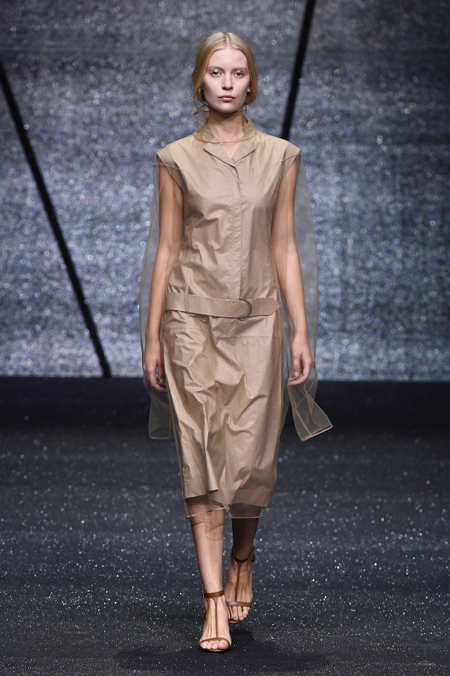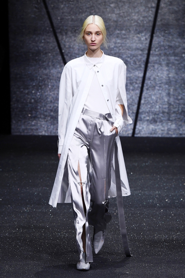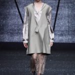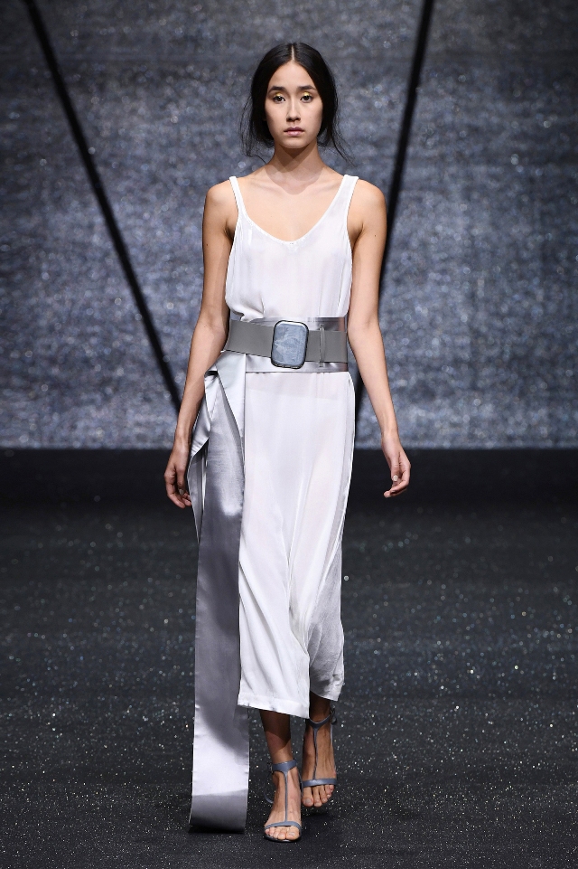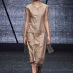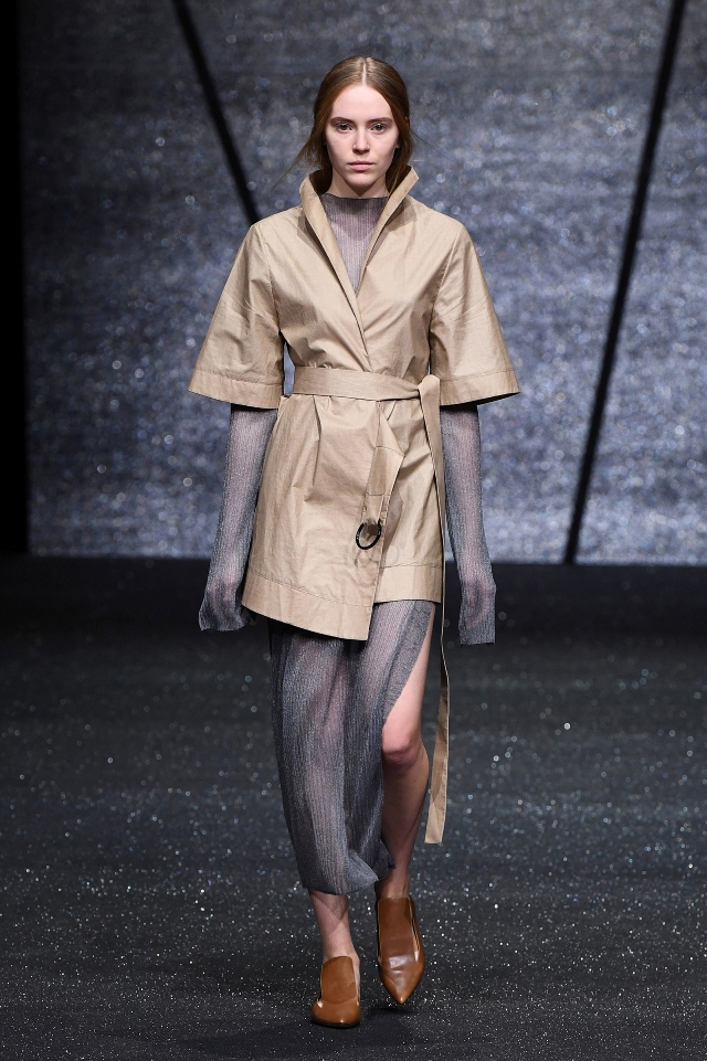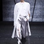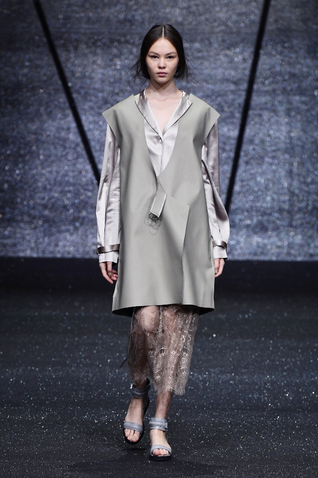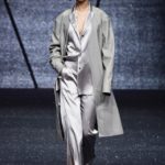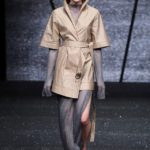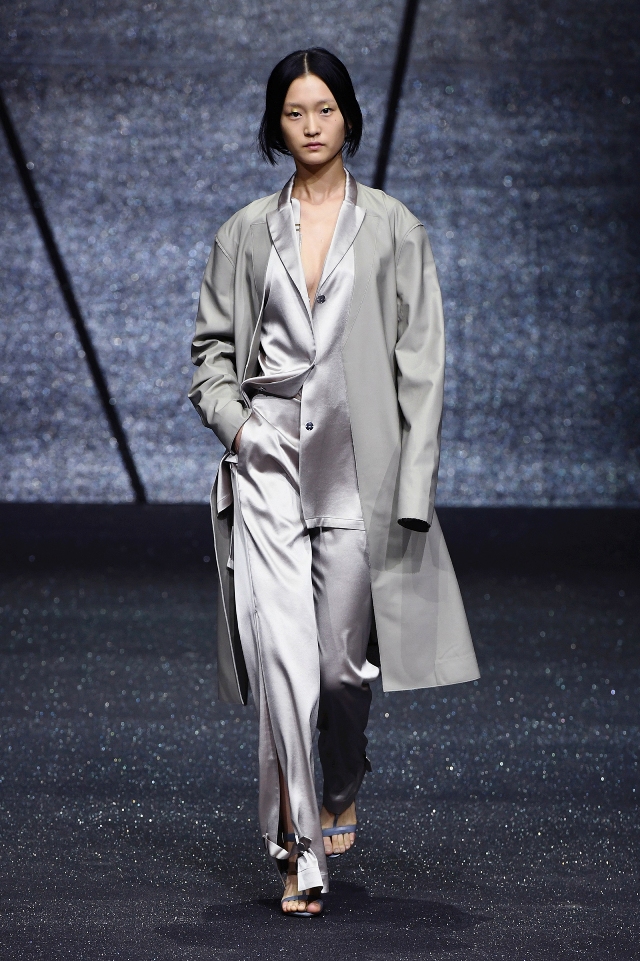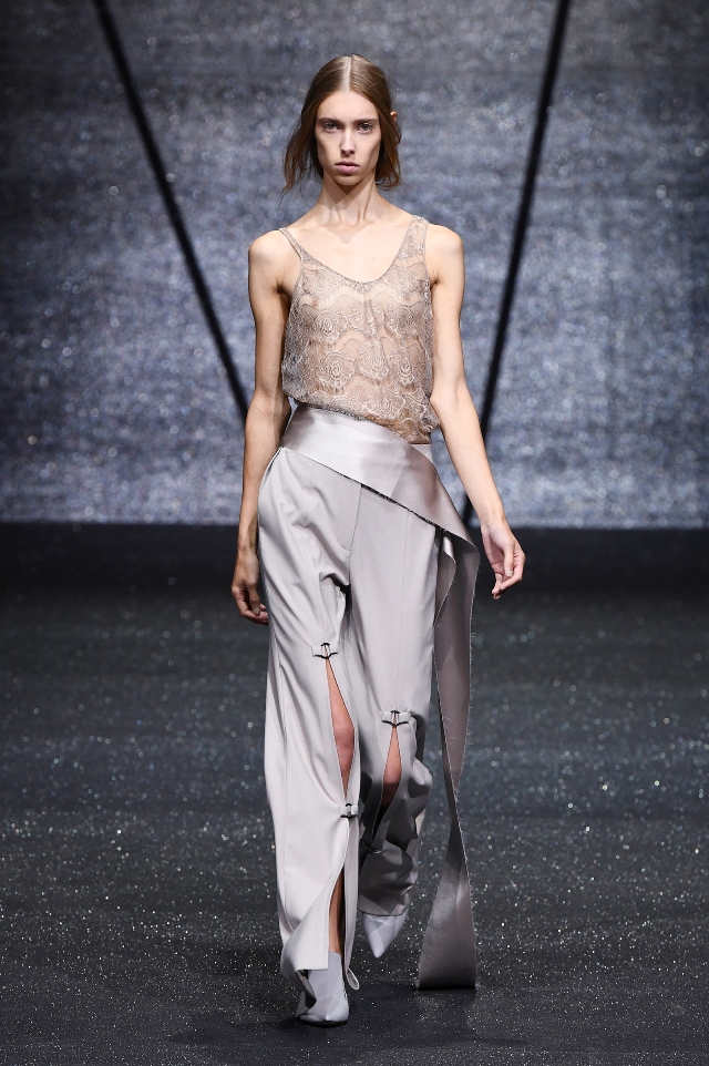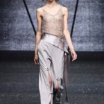 Tutto è pacato, placido, misurato e confortevole. Lo è il tailleur pigiama in raso di seta grigio chiaro che spunta da sotto uno spolverino nella stessa cromia e dalla linea fluida. Lo è lo chemisier color coloniale sormontato da una sottile tunica di tulle dello stessa neutra tonalità.Lo sono i pantaloni dal taglio morbido con spacchi semi-celati da piccole fibbie metalliche.