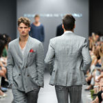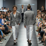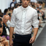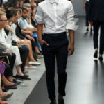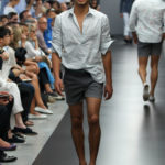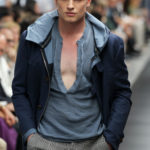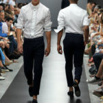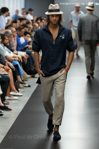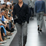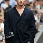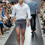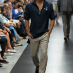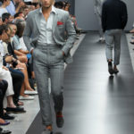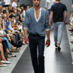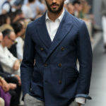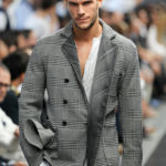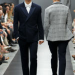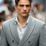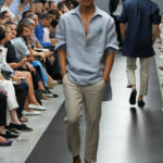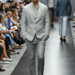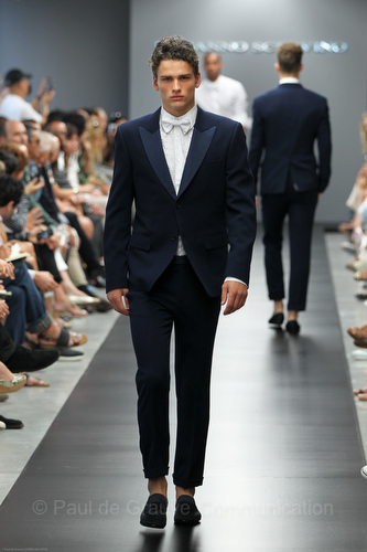 Niente di più classico dei completi e giacche sartoriali, ma niente di più attuale e trendy se sono sfoderati e decostruiti, se freschissimi per le nuove mischie di cotone lino e seta; se hanno un effetto stropicciato; se hanno una linea accostata al corpo. La linea è morbida ma asciutta. La giacca corta, dai rever piccoli nel mono petto, più importanti nel doppio petto. Il pantalone anche a vita alta è corto alla caviglia con risvolto nella versione più formale ha la piega. Alla camicia è preferito un sottogiacca leggero dalla profonda scollatura a V; è preziosa sotto lo smoking in cotone o cotone seta, polsi con gemelli, bianca con ricco e papillon bianco. Lo smoking è mono o doppio petto, blu o bianco con revers di faille di seta.