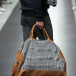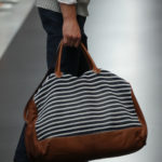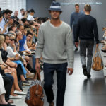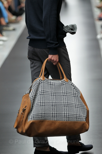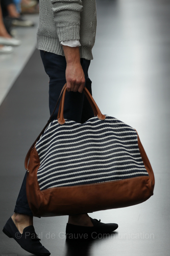 Tra gli accessori il cappello in tessuto rappresenta il filo conduttore della collezione portato talvolta come pochette; i borsoni sono in raffia tessuti nei disegni a righe e principe di Galles.