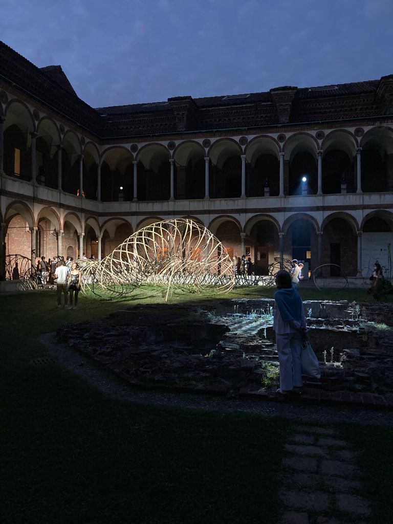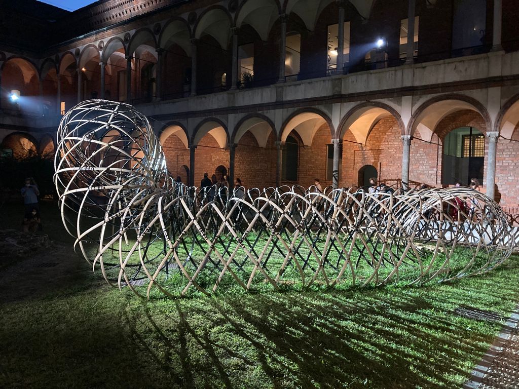La poesia della straordinaria scultura sonora “Bamboo Ring” dell’architetto Kengo Kuma in collaborazione con Oppo (il cui credo è “tecnologia per l’umanità e gentilezza per il mondo”), ambientata nel cortile dei Bagni del Filarete, incanta per la sua unicità. La fibra di carbonio si allaccia ad anelli di bambù -in un matrimonio tra materiali high tech e naturali- e il suono della violinista Midori, rielaborato con sofisticate tecnologie digitali, avvolge il chiostro e tutti i sensi con un effetto-sorpresa avvincente….