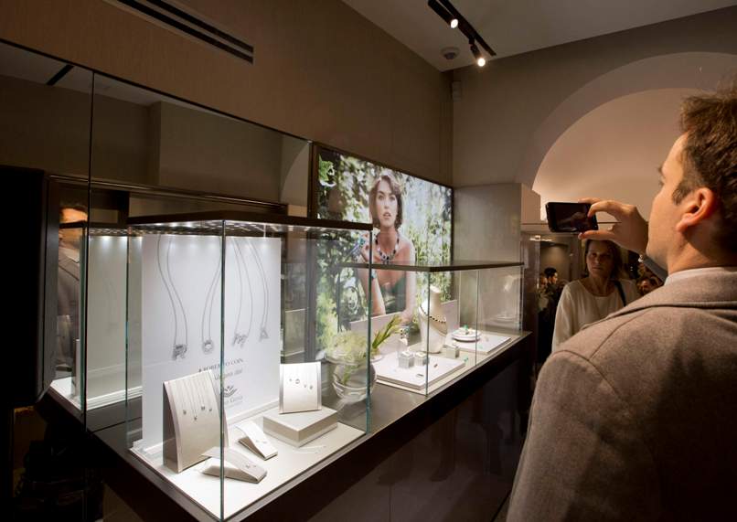Un’elegante gazebo e due gentili signorine accolgono gli ospiti all’ingresso : circa duecento metri quadri di puro folgore che trapassano via del Babbuino ed irrompono in via Margutta, la più romantica (forse), delle vie romane: la via di Gregory Peck e Audrey Hepburn in Vacanze Romane, la via di Federico Fellini e Giulietta Masina, la via di Giorgio De Chirico, ma ancor prima, la via di marmisti, cocchieri e maniscalchi; duecento metri quadri irradianti luce a getto continuo la sede della nuova prestigiosa Maison di Roberto Coin, nome, tra più influenti dell’attuale panorama mondiale della gioielleria di lusso.