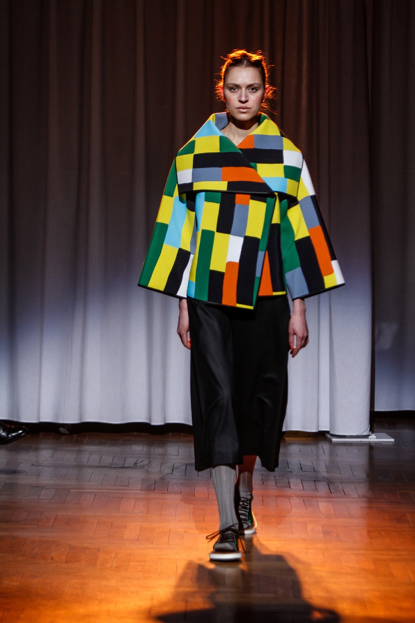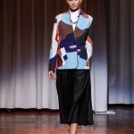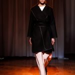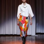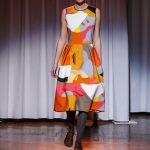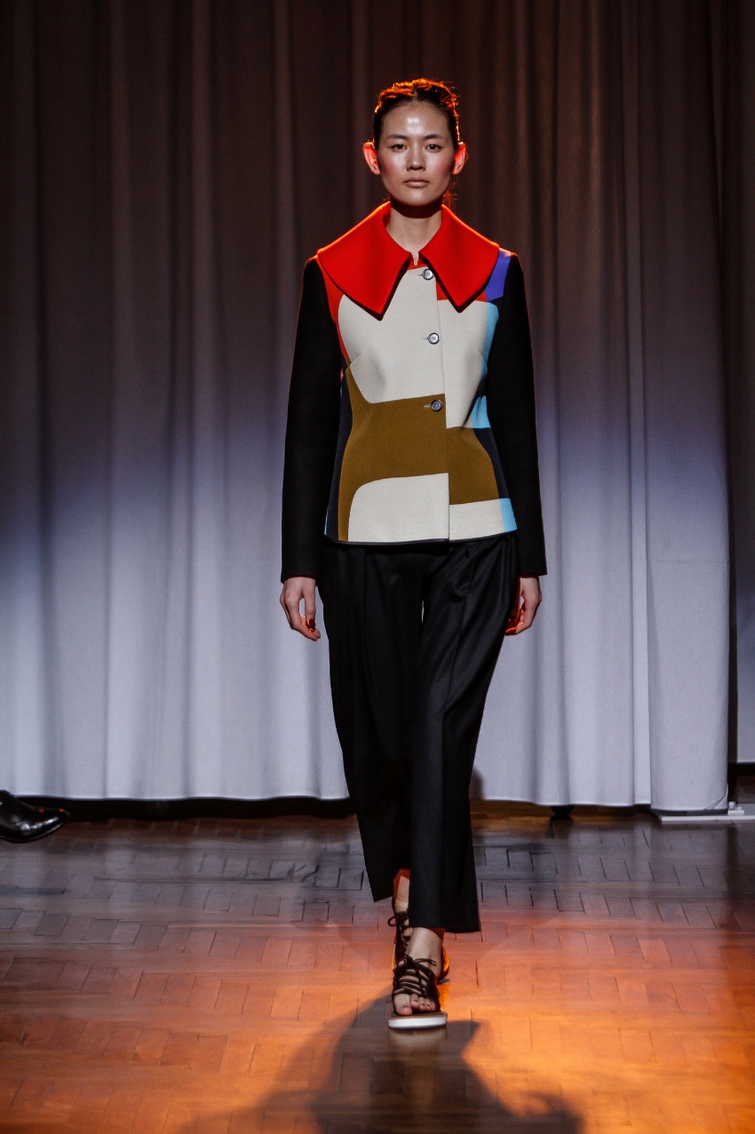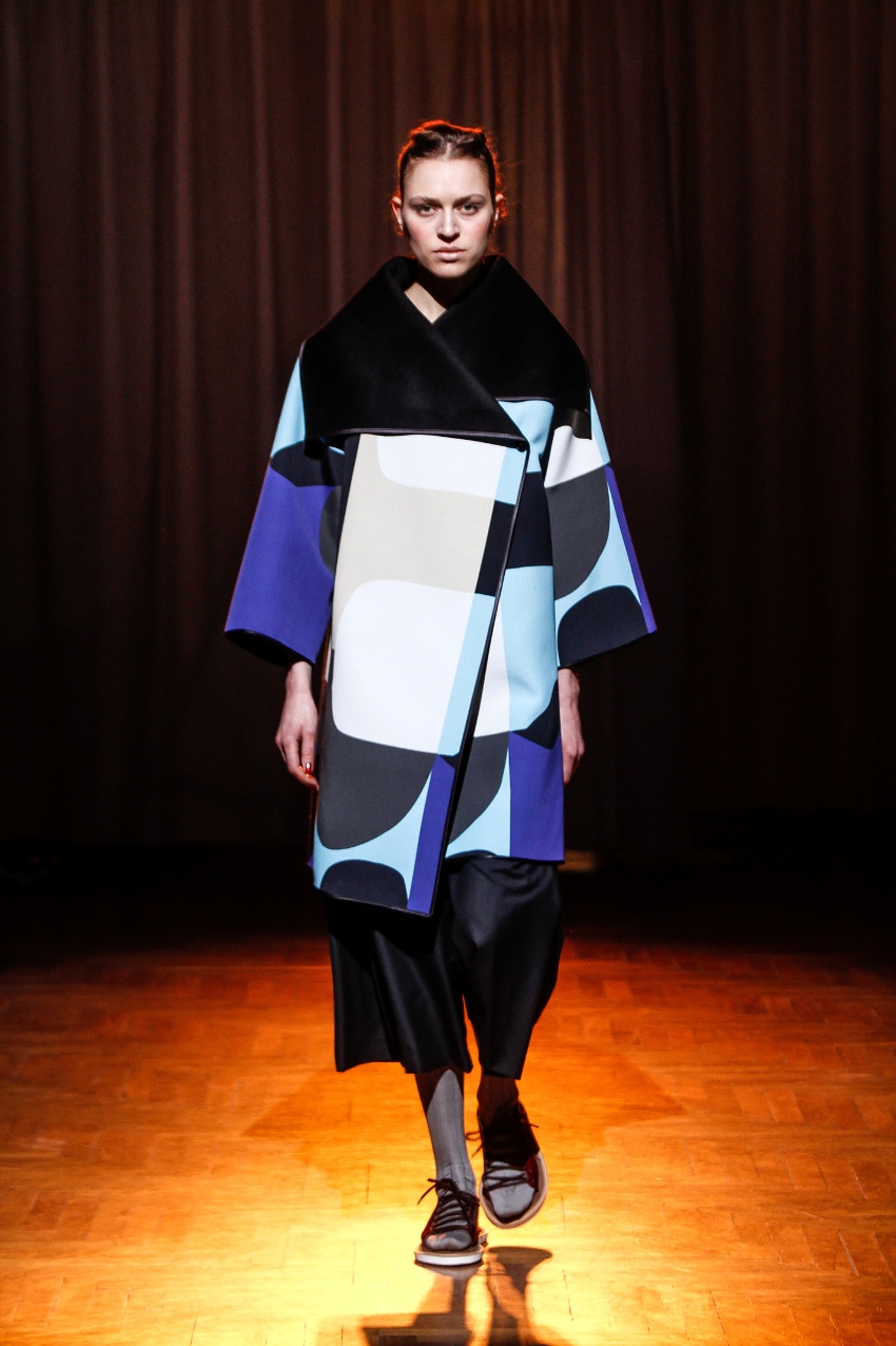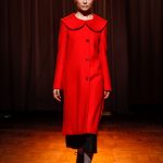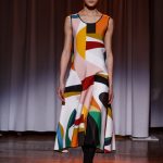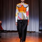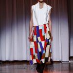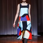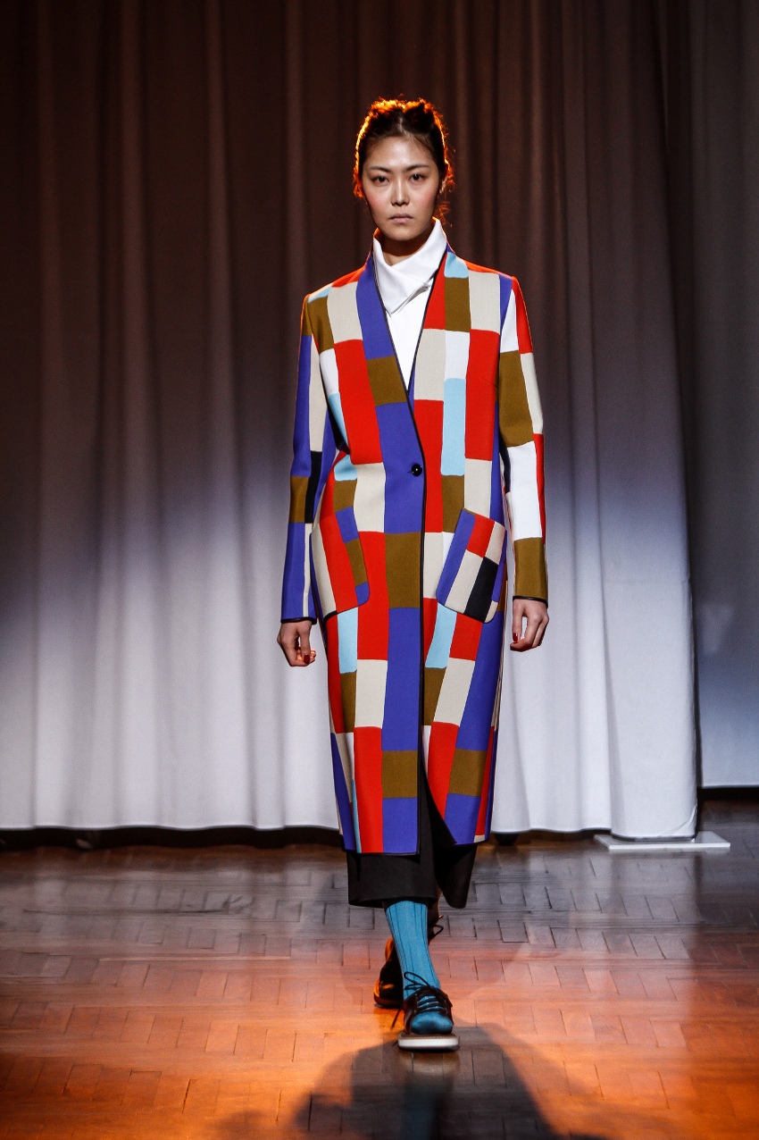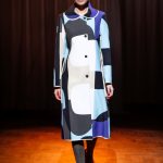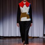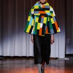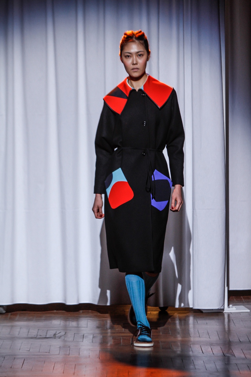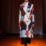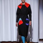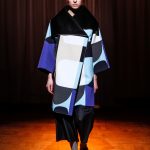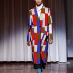 La collezione A/I 2017-18 trova il suo elemento caratterizzante nel colore; ciò non è nuovo nello stilista che si esprime spesso in modo “astratto”, attraverso la geometria e il colore. Il designer usa colori primari stampati sul tessuto a moduli geometrici in totale sintonia con la geometria delle forme. E’ il colore a dare movimento e personalità all’intera collezione. Contribuisce a definire la forma come nella giacca dall’ampio collo rosso, dove il gioco del bianco e marrone crea una asimmetria che riesce a sottolineare il punto vita. Il colore accentua la personalità del capo in un gioco di contrasti; come accade nel capotto di ispirazione orientale dal deciso collo nero e stampa a grandi chiazze dal bianco al blu, mentre la silhouette è risolta con la corposità del tessuto. E’ la disposizione del colore – giochi di macchie- che richiama l’attenzione sul cappotto dai grandi revers e due bottoni scuri all’altezza della vita. E’ il cappotto il grande protagonista della collezione: stretto in vita da un laccio, tasche asimmetriche; colorato in rosso deciso o in giallo; kimono nero chiuso da un’ alta cintura; puro gioco di tasselli colorati per ironizzarne la severa linea.