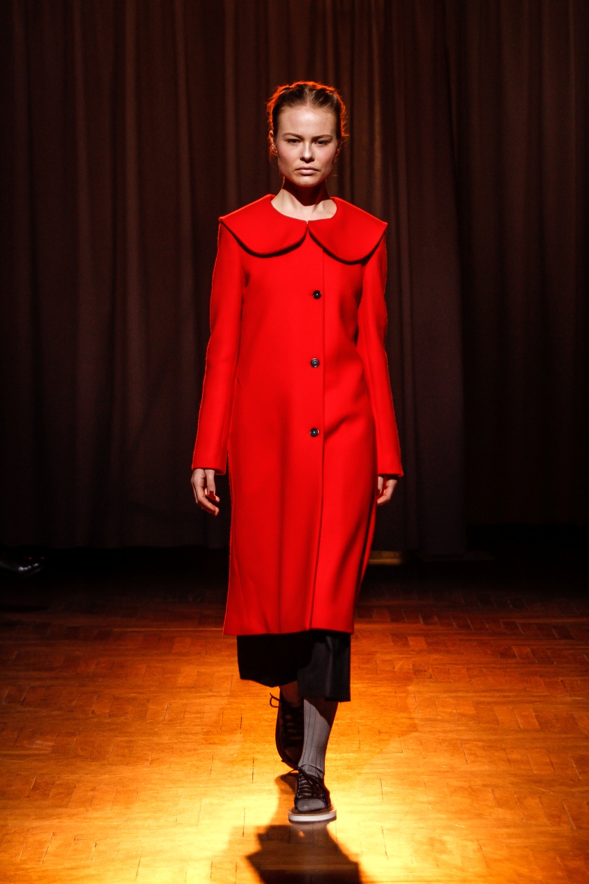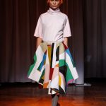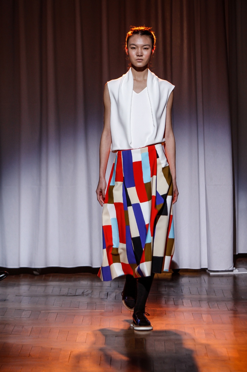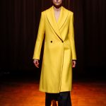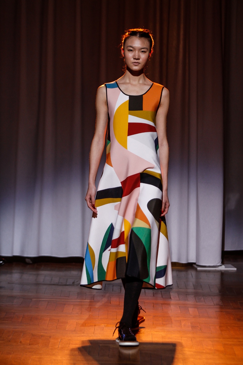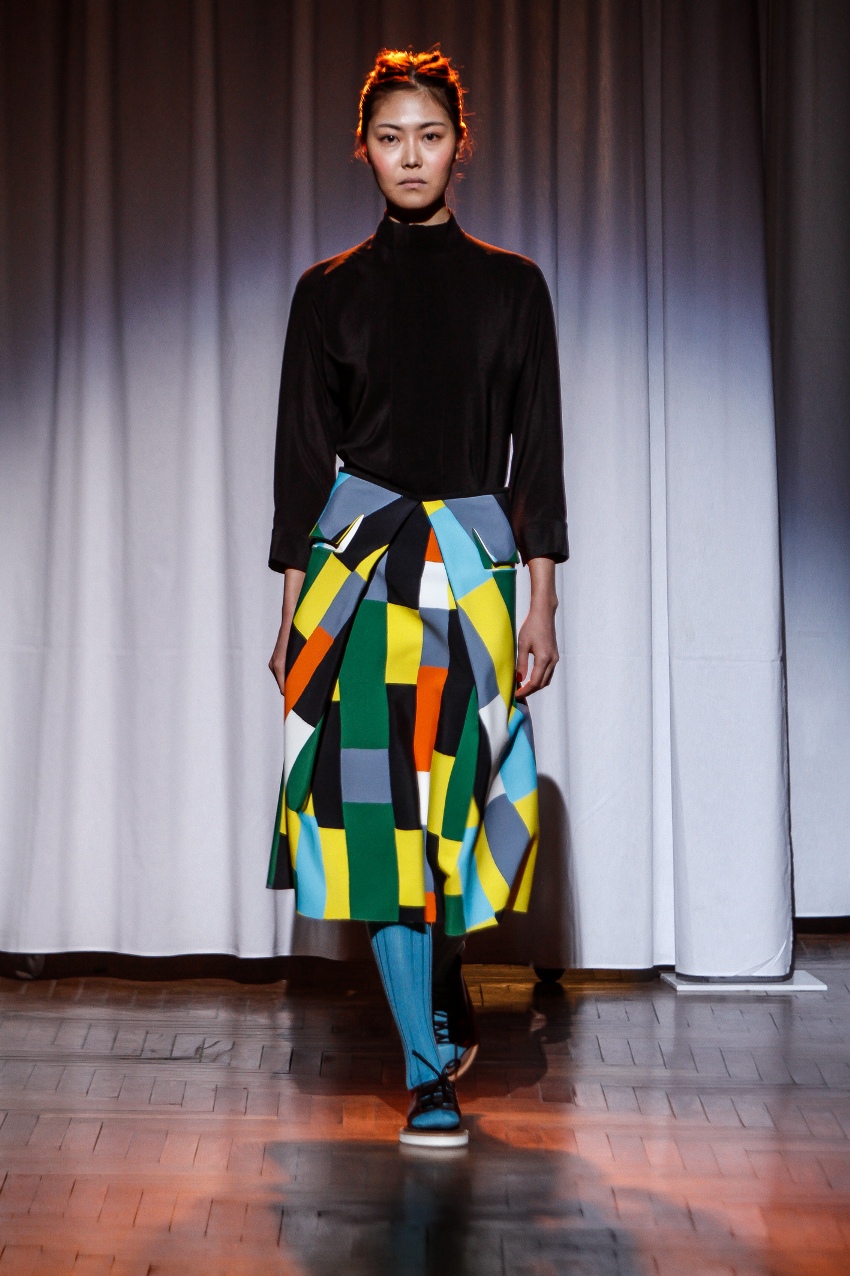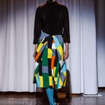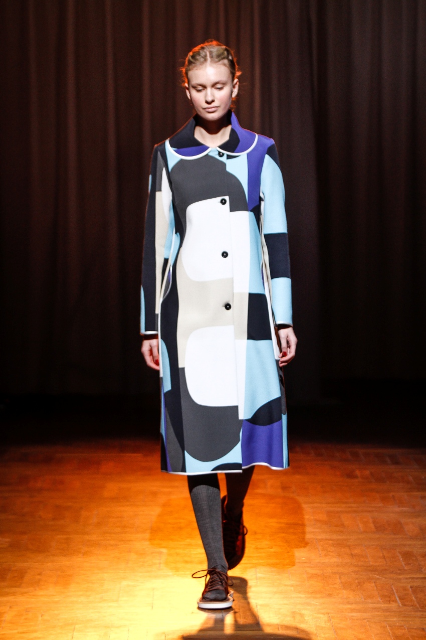 La collezione A/I 2017-18 trova il suo elemento caratterizzante nel colore; ciò non è nuovo nello stilista che si esprime spesso in modo “astratto”, attraverso la geometria e il colore. Il designer usa colori primari stampati sul tessuto a moduli geometrici in totale sintonia con la geometria delle forme. E’ il colore a dare movimento e personalità all’intera collezione. Contribuisce a definire la forma come nella giacca dall’ampio collo rosso, dove il gioco del bianco e marrone crea una asimmetria che riesce a sottolineare il punto vita. Il colore accentua la personalità del capo in un gioco di contrasti; come accade nel capotto di ispirazione orientale dal deciso collo nero e stampa a grandi chiazze dal bianco al blu, mentre la silhouette è risolta con la corposità del tessuto. E’ la disposizione del colore – giochi di macchie- che richiama l’attenzione sul cappotto dai grandi revers e due bottoni scuri all’altezza della vita. E’ il cappotto il grande protagonista della collezione: stretto in vita da un laccio, tasche asimmetriche; colorato in rosso deciso o in giallo; kimono nero chiuso da un’ alta cintura; puro gioco di tasselli colorati per ironizzarne la severa linea.
