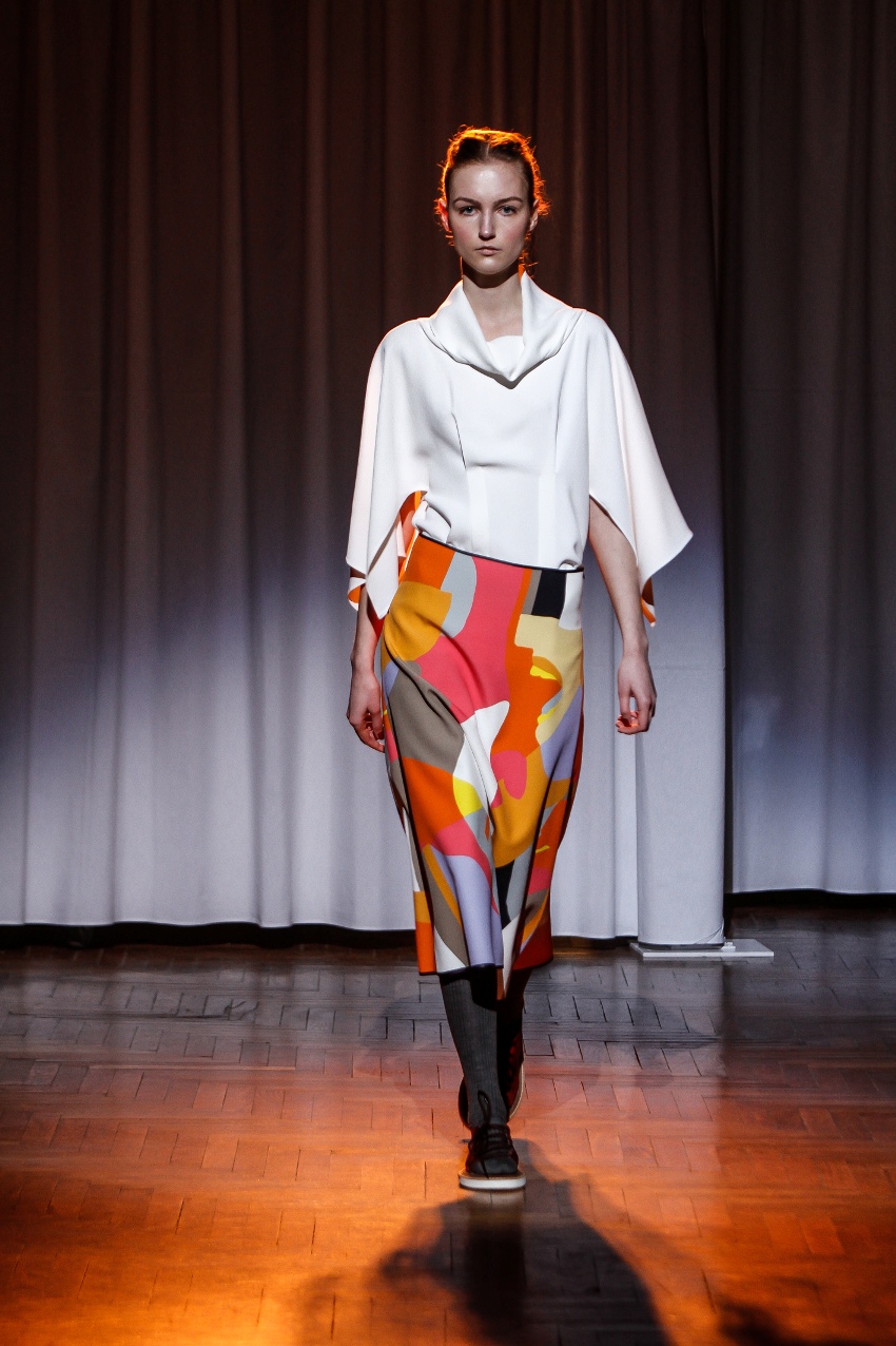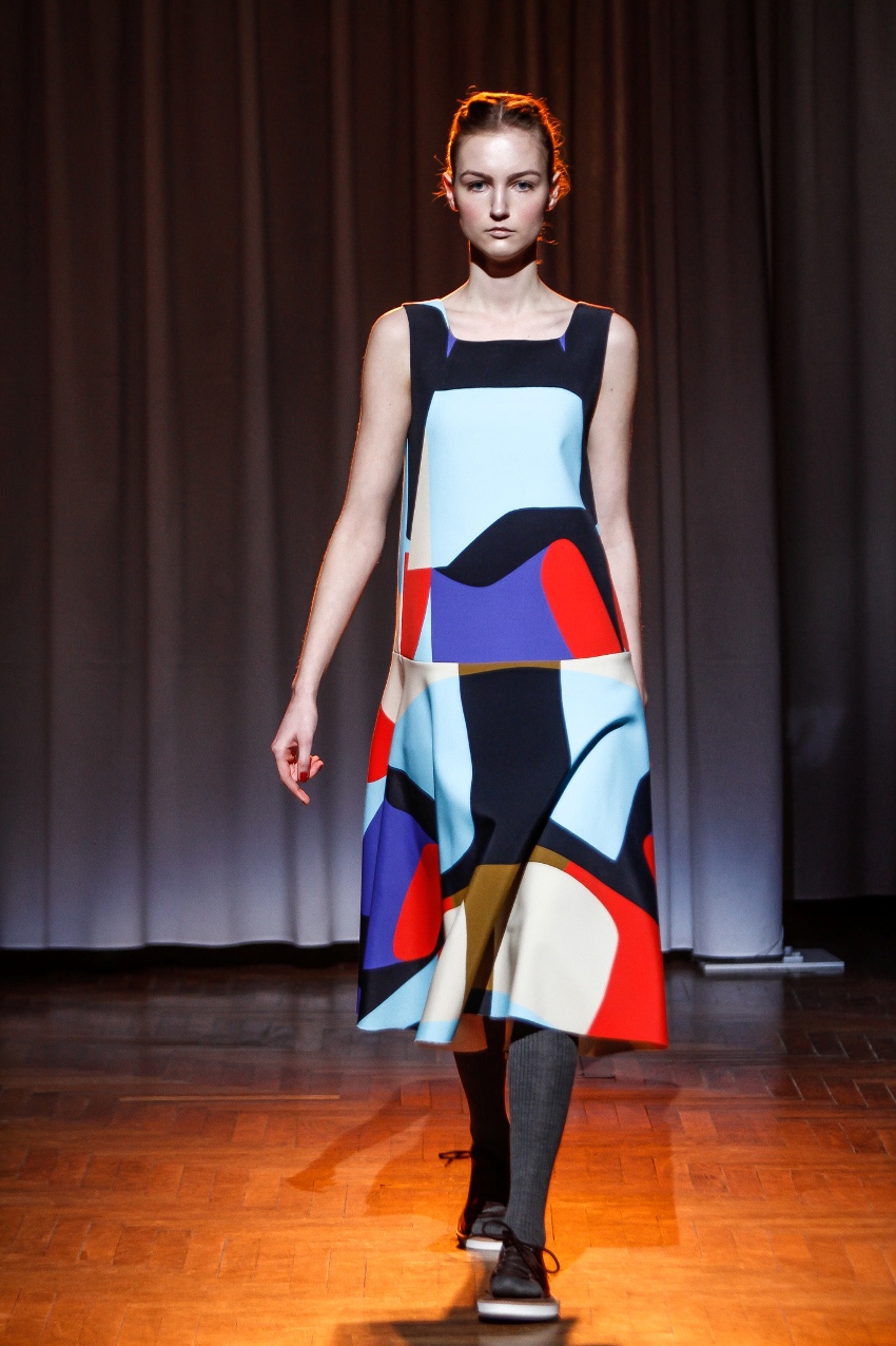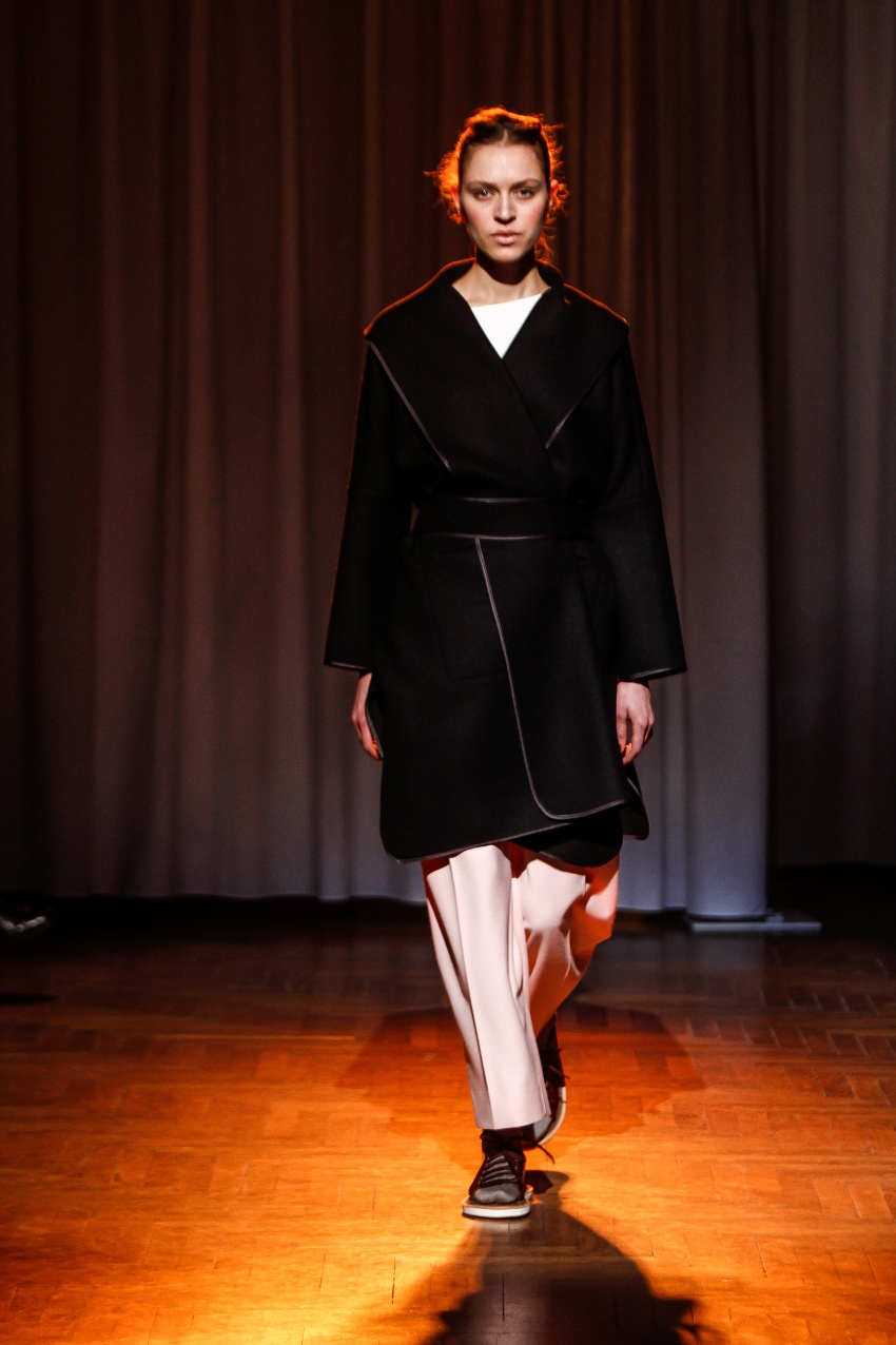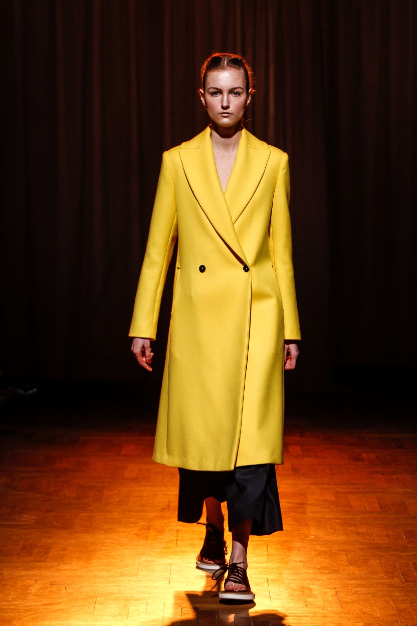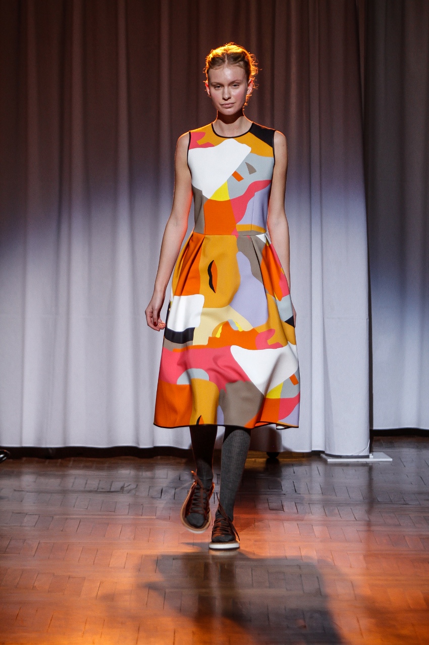La collezione A/I 2017-18 trova il suo elemento caratterizzante nel colore; ciò non è nuovo nello stilista che si esprime spesso in modo “astratto”, attraverso la geometria e il colore. Il designer usa colori primari stampati sul tessuto a moduli geometrici in totale sintonia con la geometria delle forme. E’ il colore a dare movimento e personalità all’intera collezione. Contribuisce a definire la forma come nella giacca dall’ampio collo rosso, dove il gioco del bianco e marrone crea una asimmetria che riesce a sottolineare il punto vita. Il colore accentua la personalità del capo in un gioco di contrasti; come accade nel capotto di ispirazione orientale dal deciso collo nero e stampa a grandi chiazze dal bianco al blu, mentre la silhouette è risolta con la corposità del tessuto. E’ la disposizione del colore – giochi di macchie- che richiama l’attenzione sul cappotto dai grandi revers e due bottoni scuri all’altezza della vita. E’ il cappotto il grande protagonista della collezione: stretto in vita da un laccio, tasche asimmetriche; colorato in rosso deciso o in giallo; kimono nero chiuso da un’ alta cintura; puro gioco di tasselli colorati per ironizzarne la severa linea.