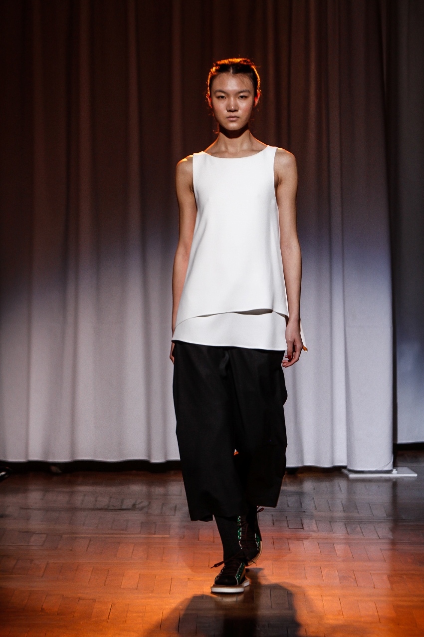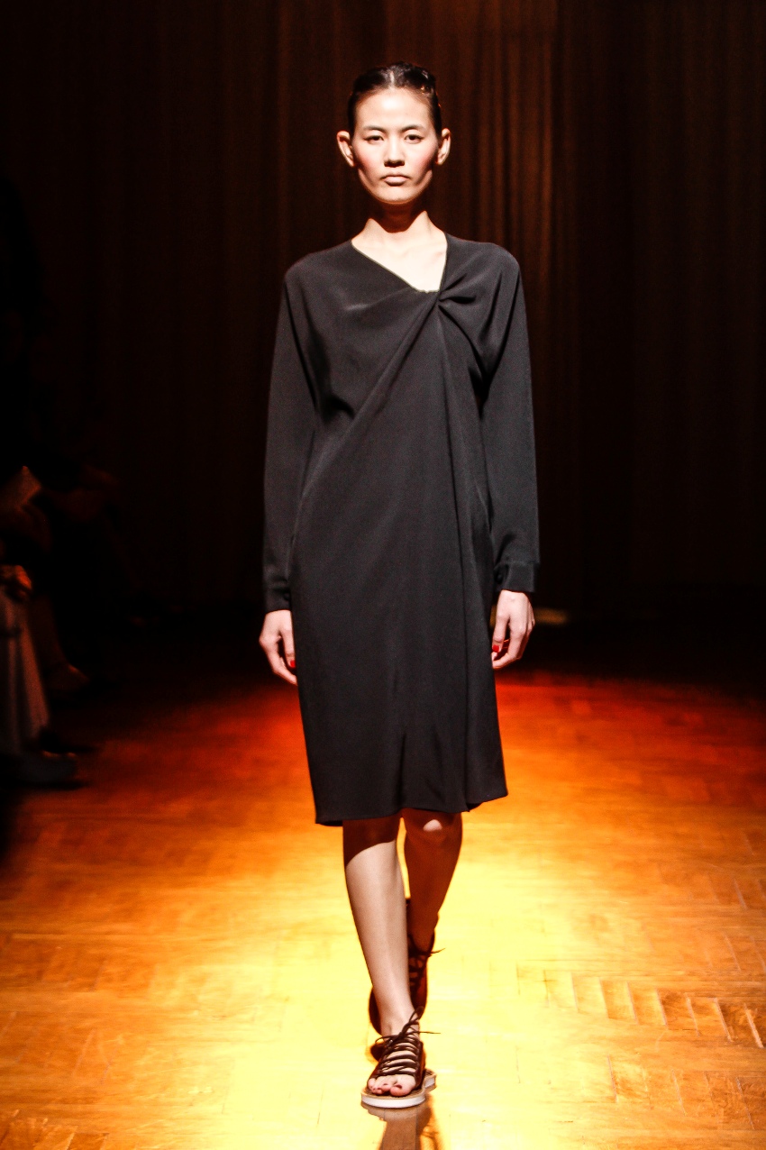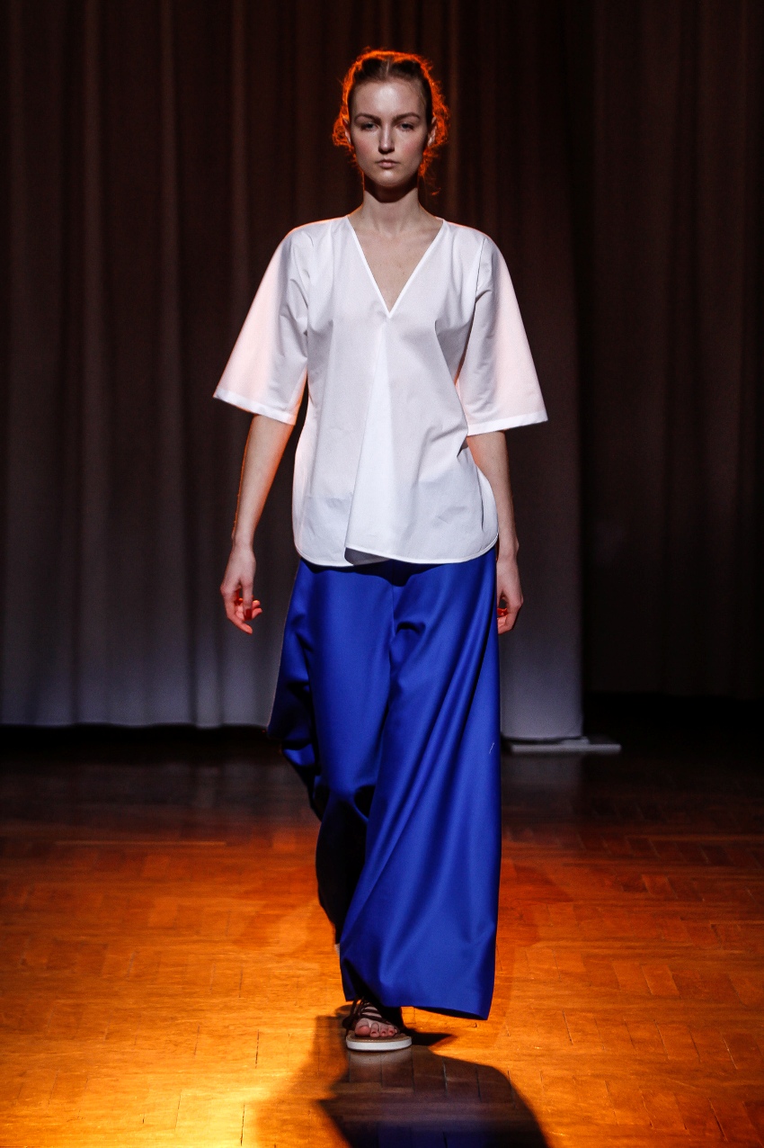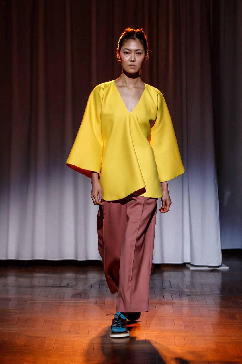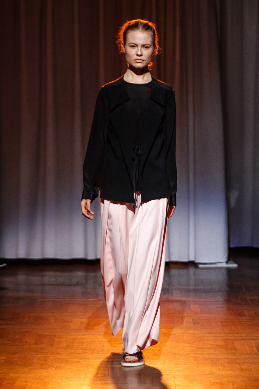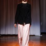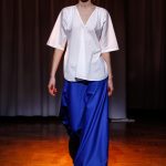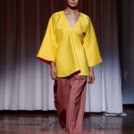 E poi i capi in tinta unita: abito rosa, pantaloni blu con camicia bianca, abito scuro trapezio doppiato asimmetricamente, pantalone terracotta con ampia casacca gialla; pantaloni rosa con giacca trompe d’œil chiusa dal un laccetto. Abiti neri e camicie bianche “pizzicati” per un piccolo drappeggio.