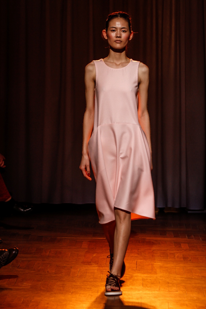 Colori tenui sugli abitini, scivolati o segnati in vita o a vita bassa, senza maniche, che danno una gioiosa sensazione di luminosità. Le gonne stampate, lunghe sotto il ginocchio come gli abiti, hanno pieghe sul davanti in una composizione origami e a canne larghe assecondata dal tessuto, vero must di Roberto Musso.