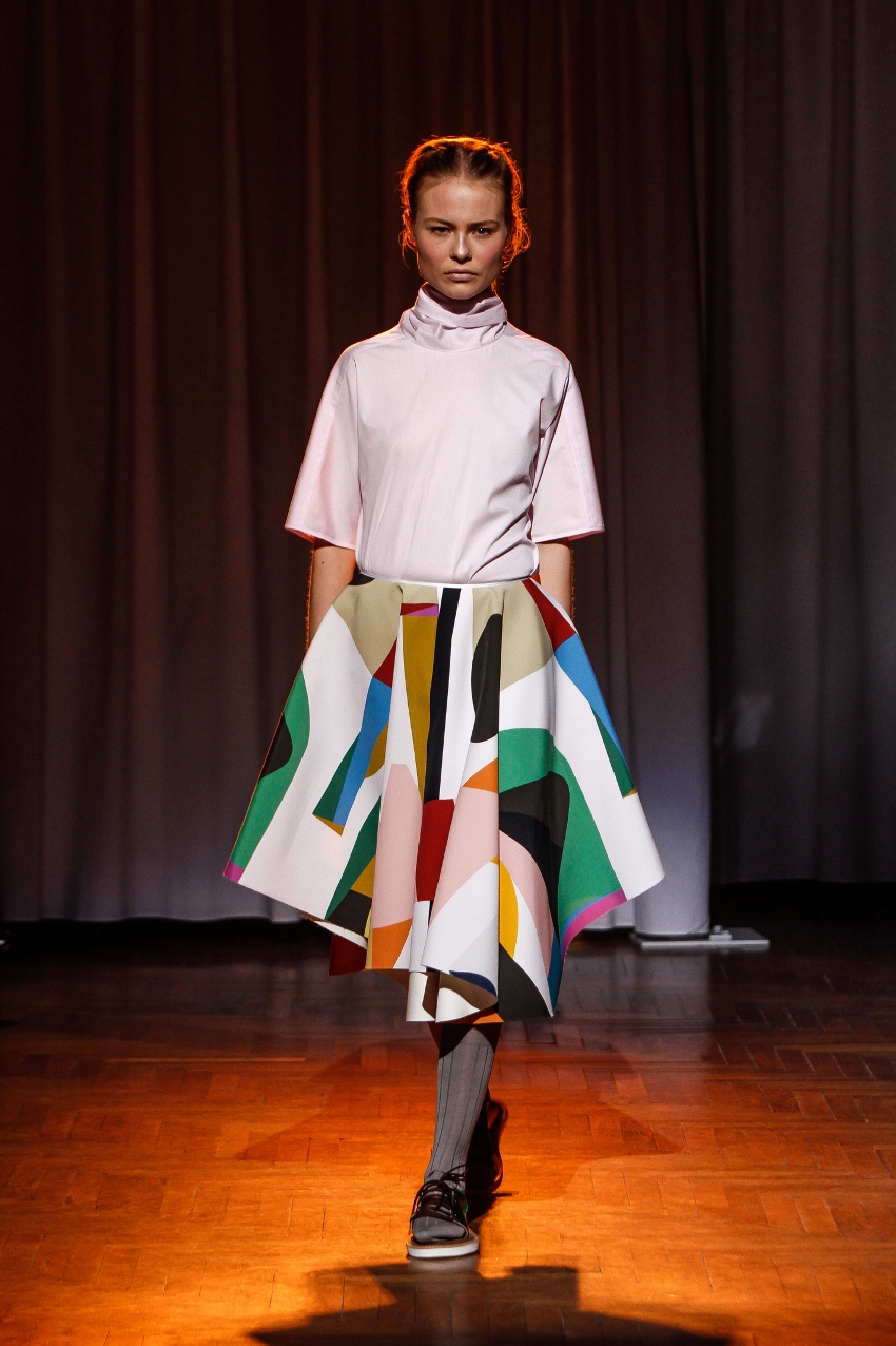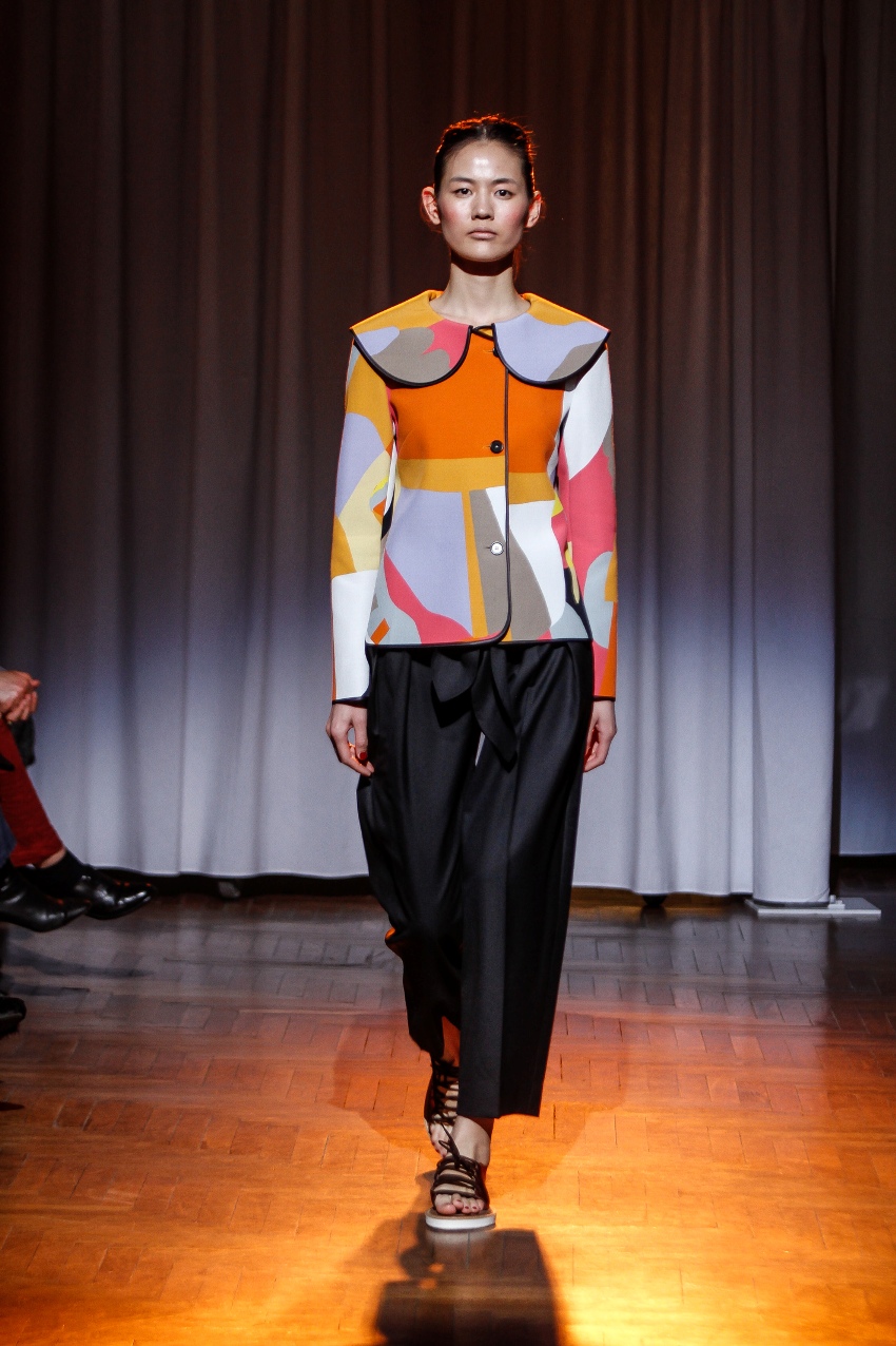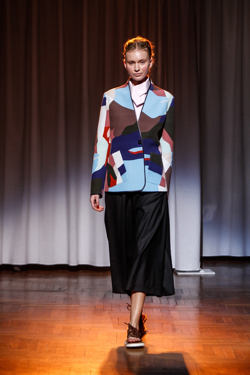 Il colore e le stampe geometriche, piccoli rettangoli, o macchie caratterizzano le giacche, piccole, delicate per accompagnare la silhouette; quelle di linea trapezio hanno maniche e colli importanti.