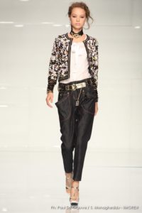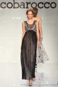 Gli abiti hanno un look essenziale, c’è un richiamo agli anni ’70, ma non vuole essere vintage, solo un ricordo; si rispolvera così l’uso del tessuto animalier tipicamente Roccobarocco, delle grosse stampe floreali, della giacca di pelle però smorzata – con giochi di accostamenti – a leggere gonne d’organza.