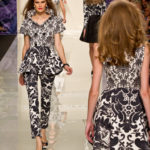 La linea dei pantaloni è abitualmente a sigaretta, mentre per le giacche il taglio è in vita e abbottonate e con baschina molto larga sui fianchi. Oltre agli orecchini belle le collane di pietre a gocce rigorosamente del colore dell’abito. I sandali sono altissimi con plateau.