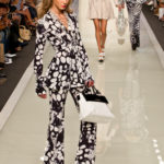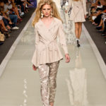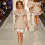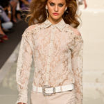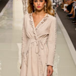 E’ il momento del beige coniugato su canape, lini, raso di cotone, e chiffon nelle gonne. Illuminato da pietre e decorazioni nelle scollature, nei tagli delle tasche, in vita; il beige sabbia si ritrova nella pelle scamosciata e traforata delle giacche e vestiti.