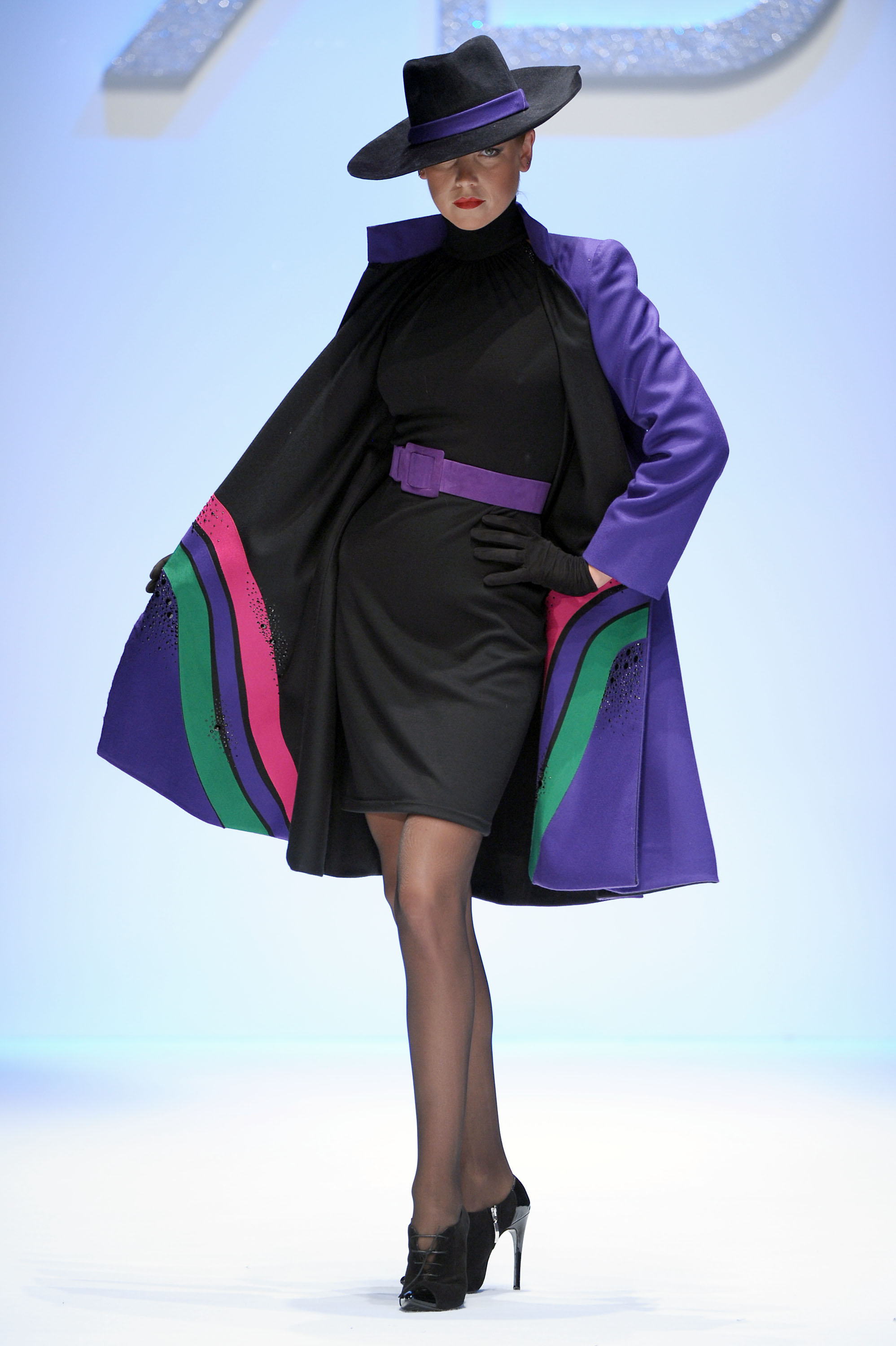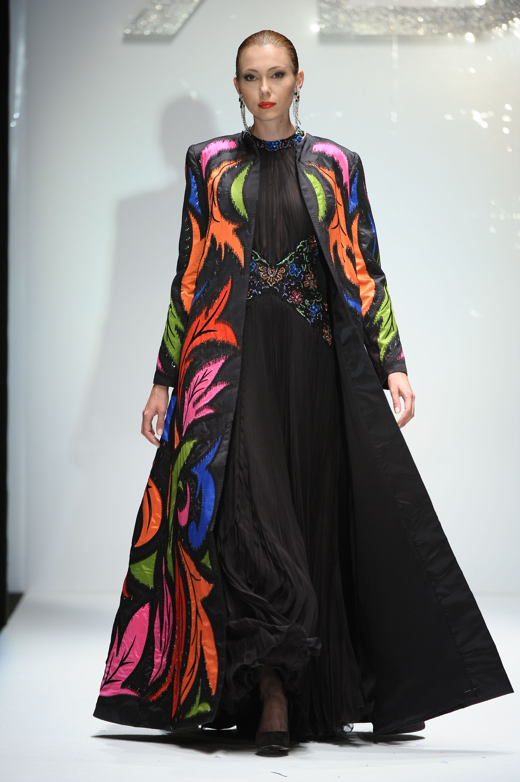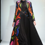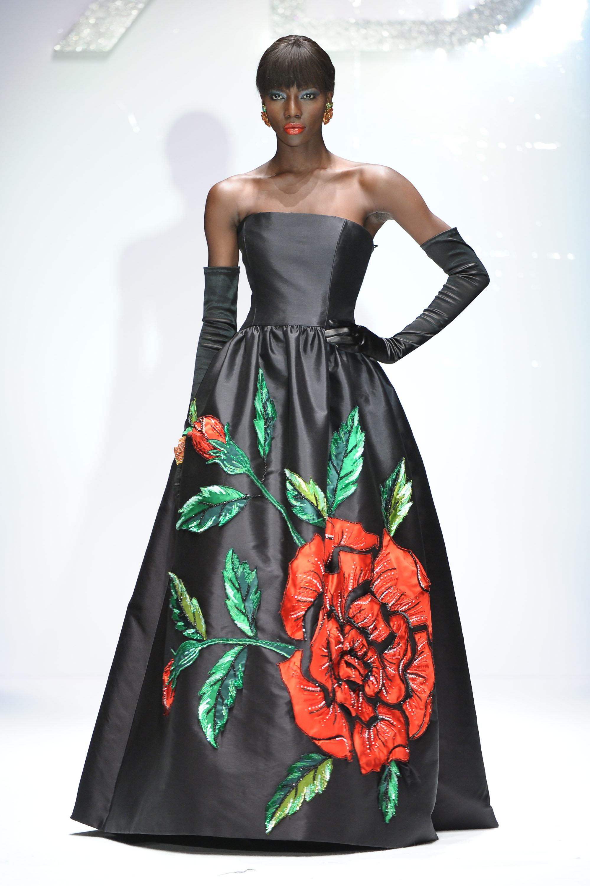 In passerella dominano dettagli, intagli e molte combinazioni fra tessuti diversi come velluto, raso e mikado perché, ha sottolineato Renato Balestra: -“Trovo che l’Alta Moda debba essere veramente Alta Moda, non solo nelle silhouette, ma anche nelle lavorazioni”. I mantelli in lana e le giacche allungate “6/8” sono lavorate con intarsi all’esterno; a sorpresa intarsi e ricami, si ritrovano anche nelle fodere interne, dando vita in alcuni casi, ad applicazioni coloratissime ad onda o fiorite. Il motivo della rosa, che orna i revers dei completi da giorno e caratterizza gli abiti da cocktail, conquista anche la sera. Una rosa gigante, rossa e in rilievo, spicca sulla gonna voluminosa dell’abito in mikado nero mentre, l’abito tubino in velluto noire, riproduce rose rosa, utilizzando elaborati vortici in tessuto. Ha sfilato tra gli altri, un modello nero, lungo con monospalla, reso intrigante da tagli e trasparenze. Le calze sono scure, i cappelli in feltro rivisitati nelle dimensioni, cedono il passo a “cappelli-acconciatura”.