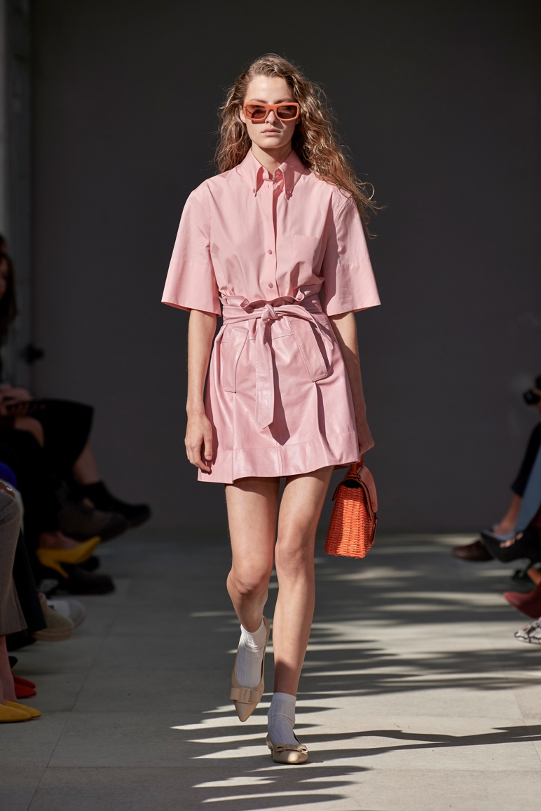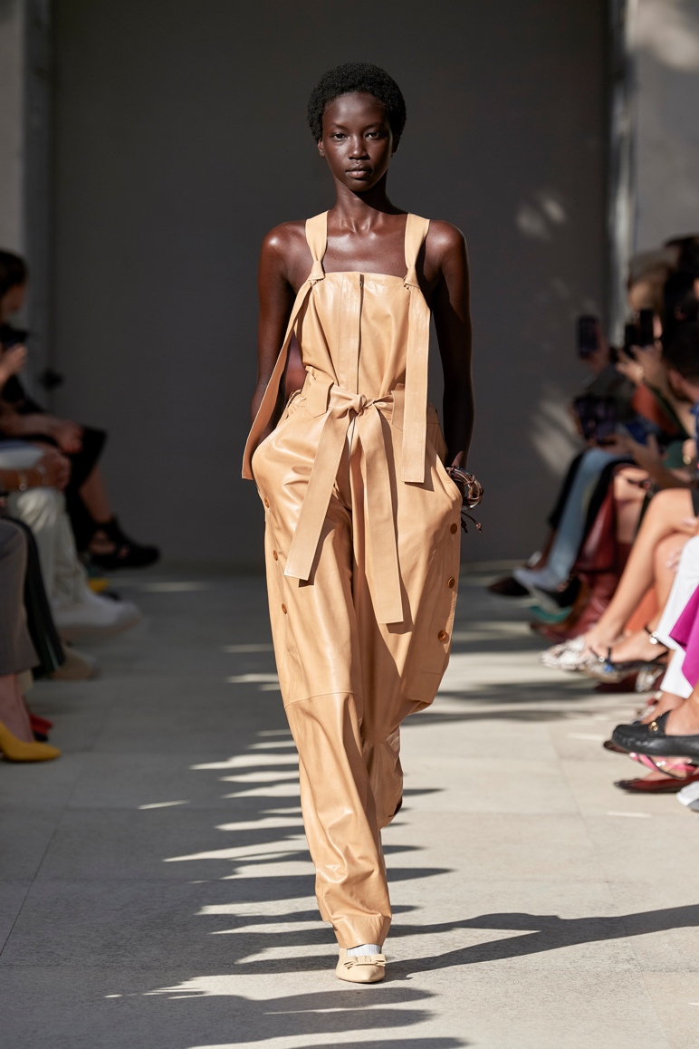 La collezione, leggera e borghese, ha una definizione nitida nelle costruzioni e un marcato tratto artigianale nella lavorazione dei pellami che si esplicita non solo negli accessori, ma anche in molte delle silhouette proposte ccome in alcune delle salopette in morbida pelle dai colori pastello, negli originali soprabiti, tute e giacche fluide dalla texture impalpabile.