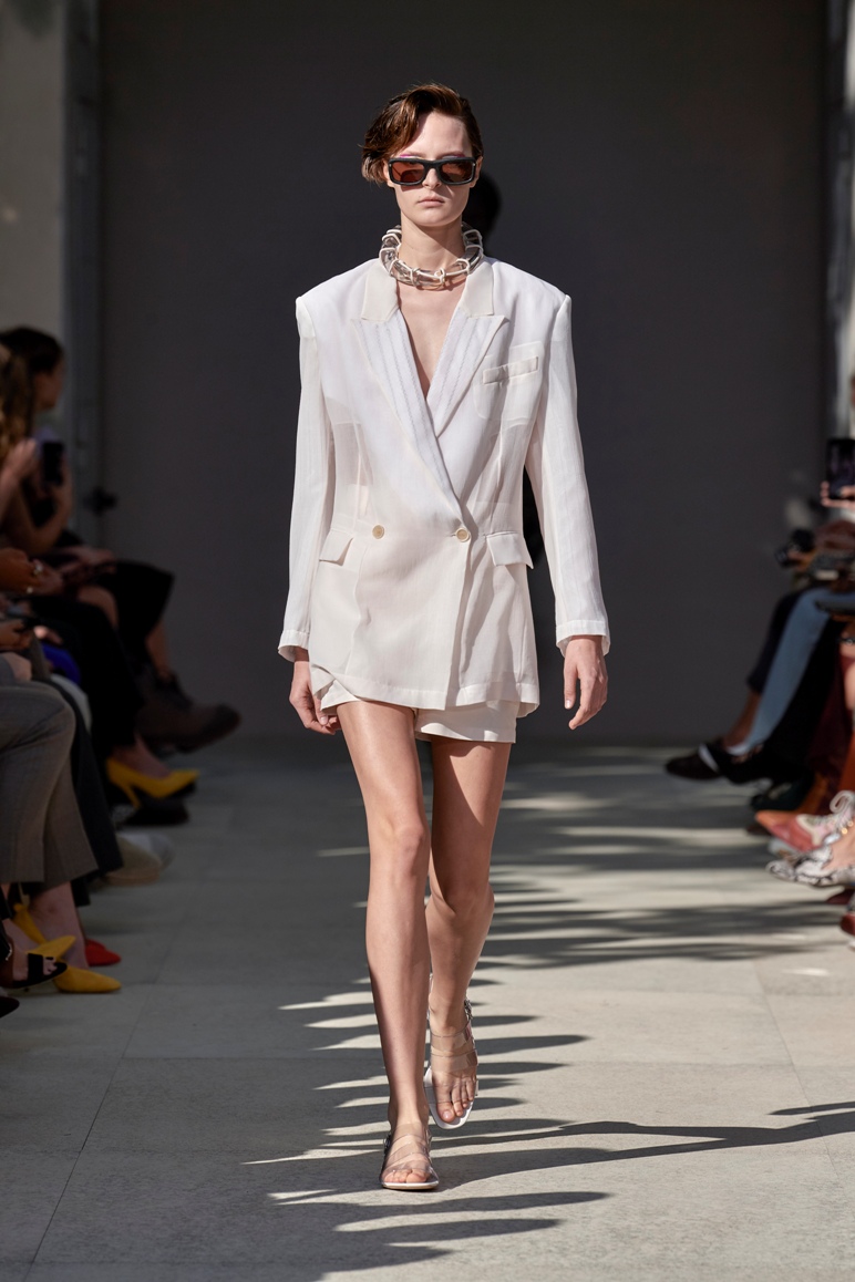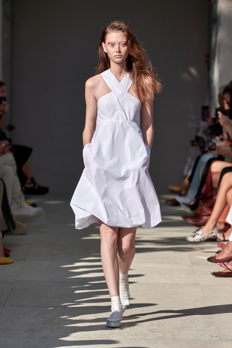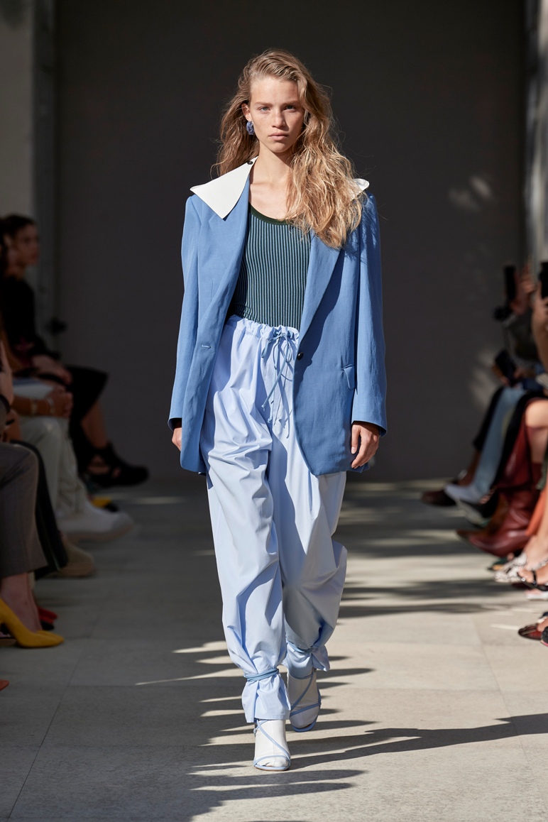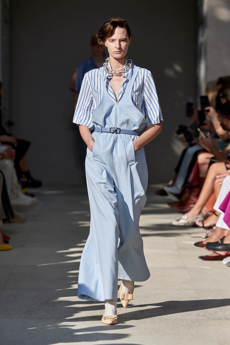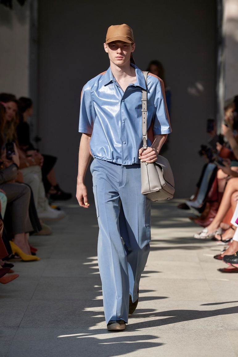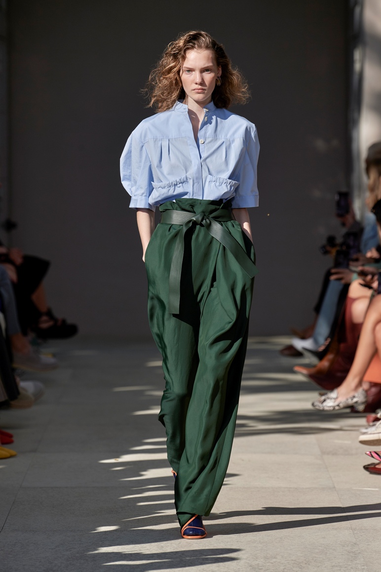 Lo sguardo rivolto agli anni ottanta emerge anche dai volumi a palloncino nelle gonne, dai pantaloni alla caviglia e a vita alta con fusciacca legata in vita dello stesso tono di colore e tessuto, dai gilet sartoriali incrociati sulla schiena come i trench e le tute, aperti, a lasciare intravedere lembi di pelle nuda. Sulla passerella anche outfit maschili.