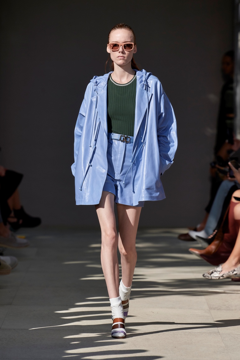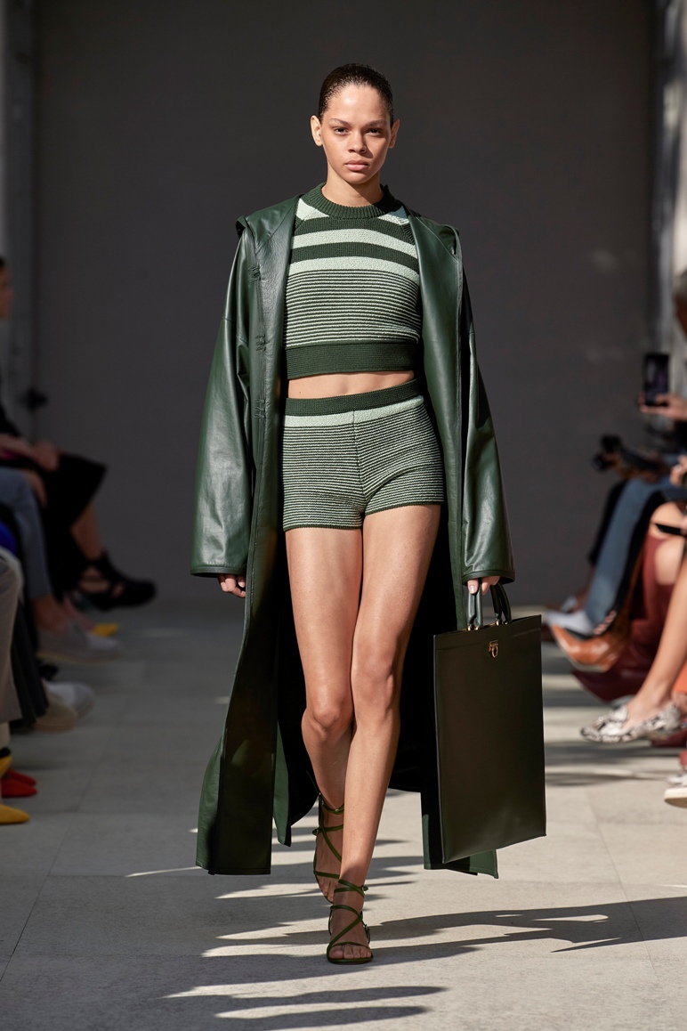 La pelle è l’elemento sublime della collezione, sviluppata in gran parte con questo materiale nobile, tanto caro alla Maison e tradotta in originali quanto sofisticati caftani e soprabiti, come quello proposto in verde sottobosco con micro bottoni dal piglio orientale combinato al micro top e shorts tricot.