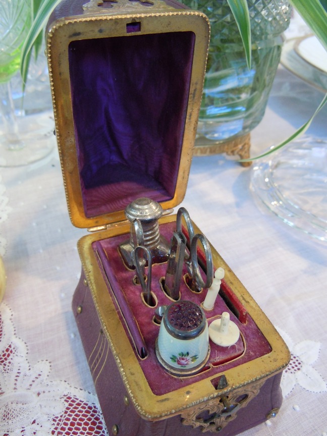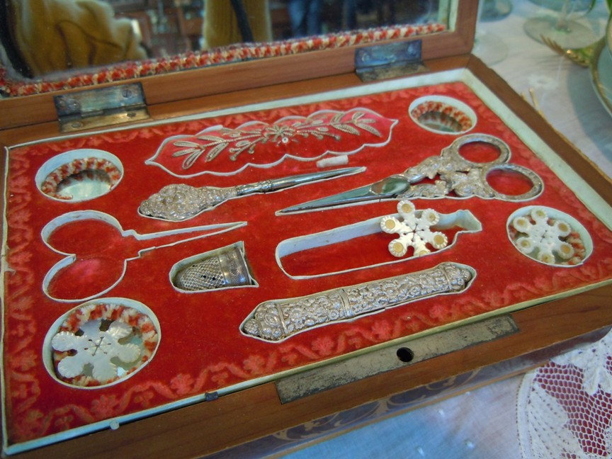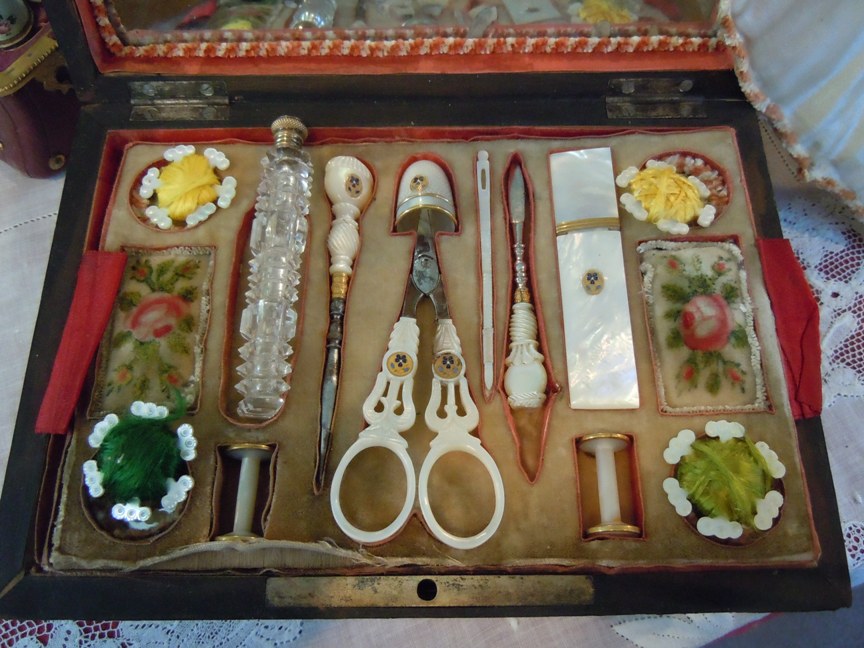 Di nuovo una curiosa e preziosa scatola da cucito in legno decorato con all’interno piccoli oggetti in madreperla e oro fine Ottocento della cortese e simpatica gallerista Gabriella Rollo di Cremolino (Al).