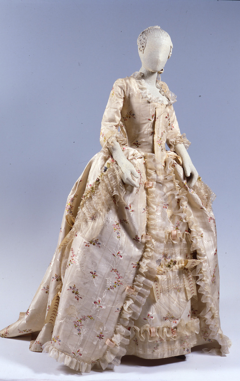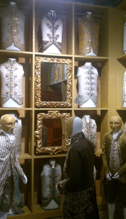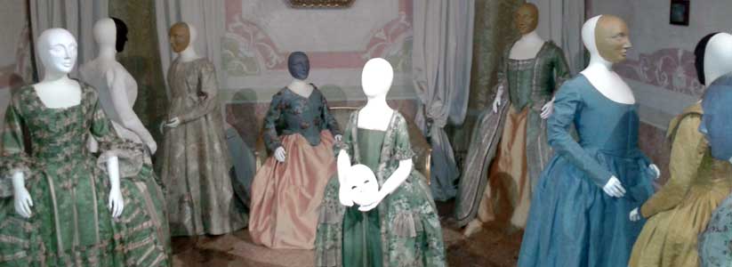 Di notevole interesse, infine, è la collezione di abiti e accessori provenienti dal Museo Correr e da Ca’ Rezzonico, circa 800 pezzi che documentano per lo più la moda del Settecento. Si tratta di un’importante raccolta formatasi fra la fine dell’Ottocento e l’inizio del Novecento con le donazioni al museo cittadino da parte di famiglie, antiquari e collezionisti, tra i quali rammentiamo Valzer, Martinengo, Cantoni, Boldù, Costantini, Guggenheim, Levi. Fra i 175 accessori sono comprese borse, ventagli, cappelli, scarpe, guanti e altro, molti pezzi di ottima qualità se fattura; fra i tanti va ricordato il nucleo dei ventagli settecenteschi, mentre fra le calzature degni di nota sono i “calcagnetti” del XV secolo. Veramente ricca la collezione di costumi, con numerose “andrienne” in buono stato di conservazione databili alla seconda metà del XVIII secolo. Altrettanto numerosi sono i completi maschili riconducibili al medesimo periodo, mentre la splendida serie delle marsine ricamate è ricca al punto che permette di tracciare il quadro completo dell’evoluzione di questa tipologia di vestiario dal Settecento all’Ottocento. Più di un centinaio di bellissimi gilet costituiscono, poi, la sezione più preziosa della collezione. Si trovano esemplari del 1740-1750, ma soprattutto innumerevoli articoli della seconda metà del secolo di ottima fattura e particolare bellezza. Davvero speciale, da ultimo, è il nucleo di abiti dell’Ottocento con capi del periodo neoclassico, alcuni pezzi infantili del Settecento e soprattutto le vesti di “procuratore” che per molto tempo furono esposte a Ca’ Rezzonico.