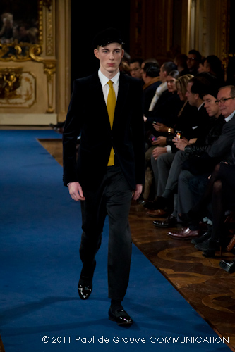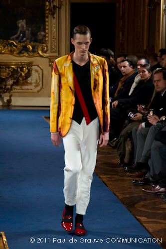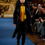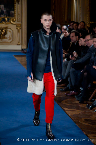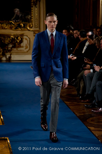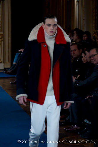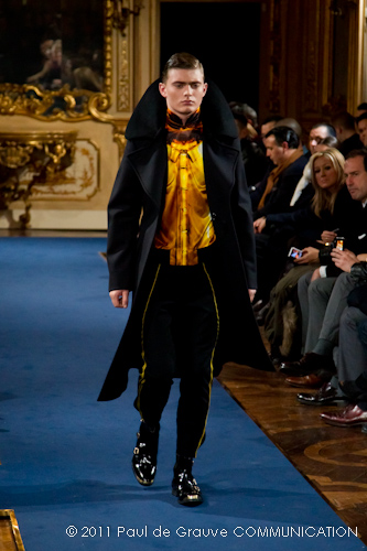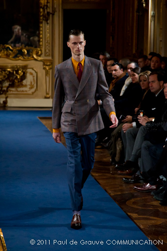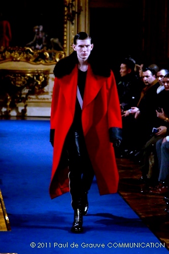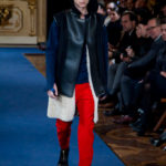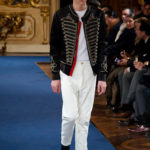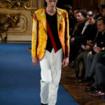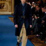 Accanto ai capi di sapore prettamente militare, capi assolutamente classici, nei classici tessuti e colori dell’abbigliamento maschile: completo principe di galles, spezzato in grigio con giacca doppiopetto; spezzato con pantalone grigio e giacca blu; una uniformità rotta solo da alcune stampe su fondo bianco. Sarah Burton quindi non si distacca dalla tendenza, già rilevata in altre collezioni, di un ritorno al classico anche se rivisitato in chiave più moderna. Aggiunge anche lei qualche elemento di attualità, il pantalone è talvolta più corto spesso però è largo, la giacca è accostata in vita a contrasto con quelle voluminose indossate sopra altre; qualche cappotto leggero dalla silhouette smilza fa da contrappunto a quelli ampli, dagli ampli baveri impellicciati. I colori di rottura rosso lacca dei pantaloni, giacche e cappotti o usati anche come una pennellata trasversale su un sottogiacca/gilet, il giallo delle camicia di raso richiamano anche essi lo stile militare: il rosso è un colore abituale in questo abbigliamento.