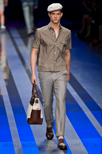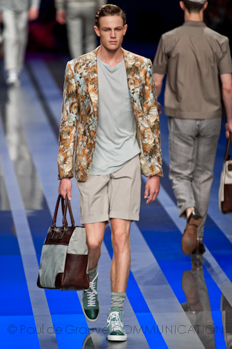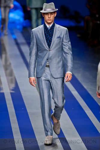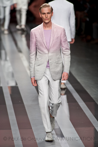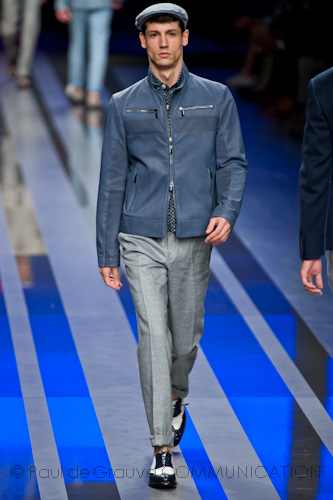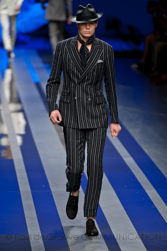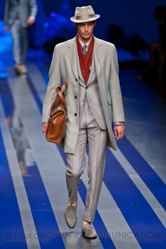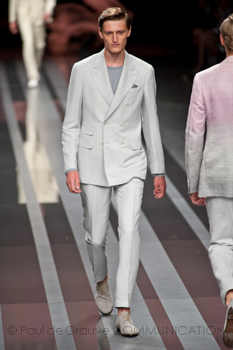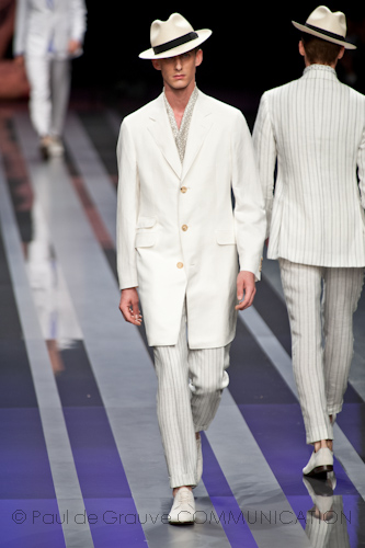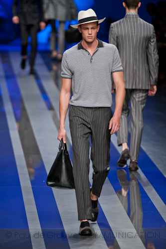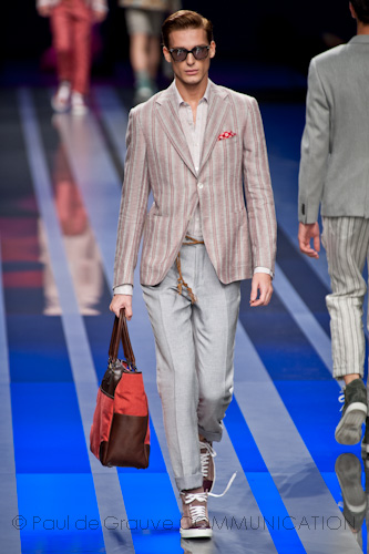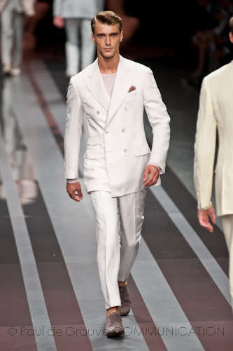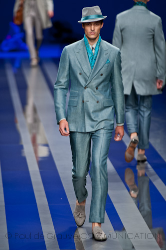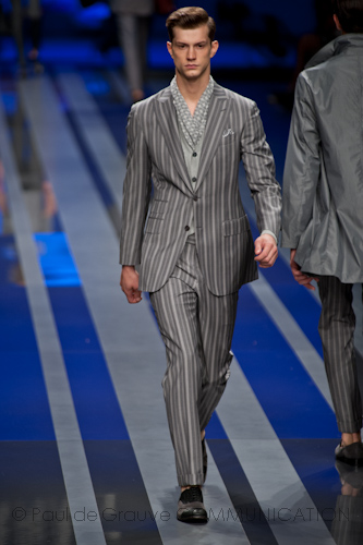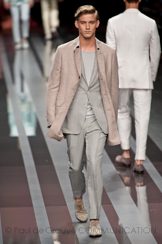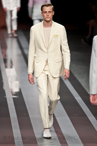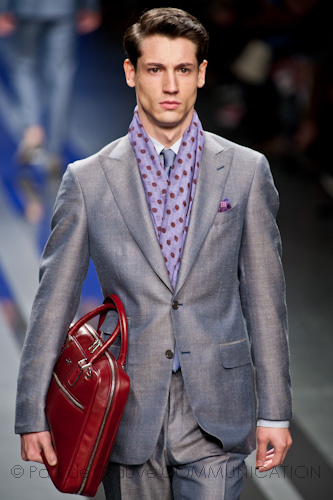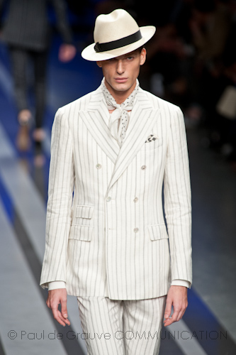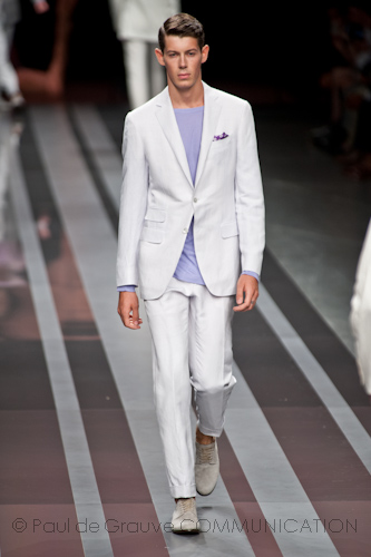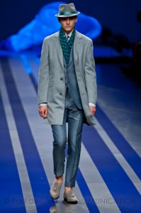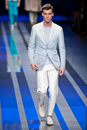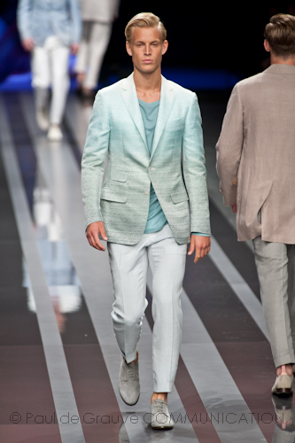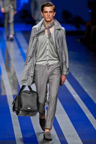 La sfilata si apre con un gioco meraviglioso ed ipnotizzante: due grandi teli, impalpabili, leggeri, eterei sembrano rincorrersi ondeggiando in aria, avviluppandosi l’uno all’altro in infinite spire, contorcendosi e poi innalzandosi nuovamente liberi. Uno è bianco puro, l’altro di un profondo nero: sacro e profano che si intrecciano, si inseguono, si separano salvo poi rincontrarsi inevitabilmente. E’ questa la nuova collezione uomo p/e 2012-13 di Canali: una mescolanza di generi e stili, il casual con l’alta sartorialità, in un’armonia sempre perfetta, che si rinnova uscita dopo uscita.