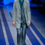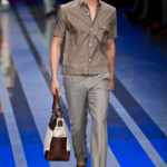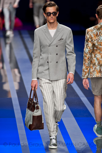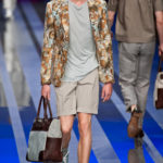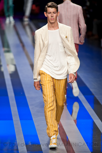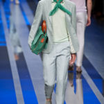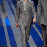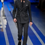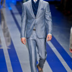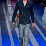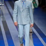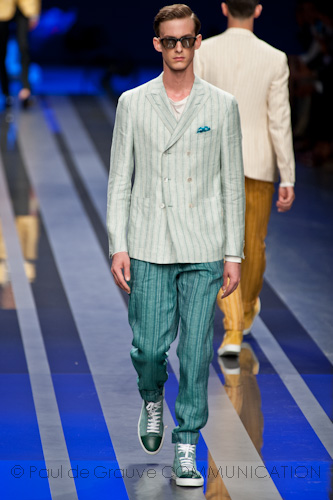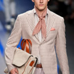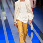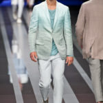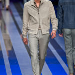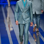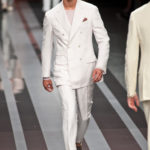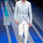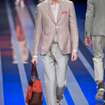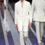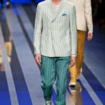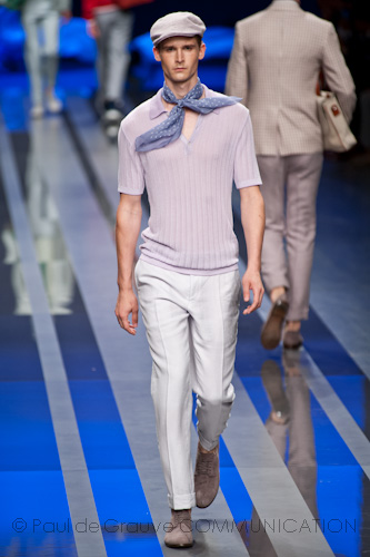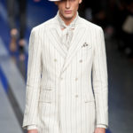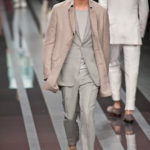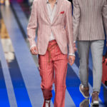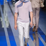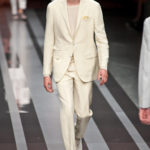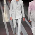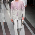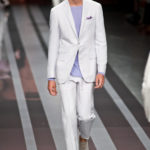 I primi completi rappresentano l’ispirazione centrale dell’intera collezione: raccontano di passeggiate sul lungomare al tramonto, circondati da palme e accarezzati dal vento. Sono abiti in cotone e seta, leggerissimi alla vista così come – possiamo ben immaginare – al tatto, dai colori anch’essi impalpabili, ma dal taglio assolutamente rigoroso. Prima i più formali, che nascondono tuttavia dei tocchi easy – come pochette o foulard a pois o con stampe optical. Sulle teste cappelli modello Panama. E’ palese il richiamo alla vecchia Hollywood anni ’50 e ’60. Appaiono i classici gessati, stavolta però in lino – il concetto di leggerezza non si perde mai. Ed è inevitabile pensare ai personaggi dei vecchi film noir, Al Capone in “Scarface”, che sorseggiano colorati cocktail a bordo di lussuose piscine. La linea delle giacche – sfoderate o semi sfoderate – riprende da quegli anni le linee sagomate con il punto vita segnato – sia nel doppiopetto a sei bottoni, sia nel monopetto con revers a punta lancia, il rever a lancia stondato, il taschino a barchetta e le spalle costruite ma al tempo stesso morbide. Poi una lieve virata verso l’informalità, gli abiti a poco a poco si spogliano del superfluo e i colori si fanno delicati: danno l’illusione del bianco, ma si rivelano essere tenui azzurri, gialli smorzati, verde acqua, delicati glicine e rosa. In sostituzione della camicia, vi si abbinano t-shirt in tinta, cascanti, scivolose.