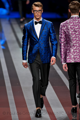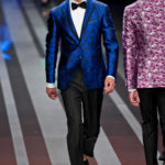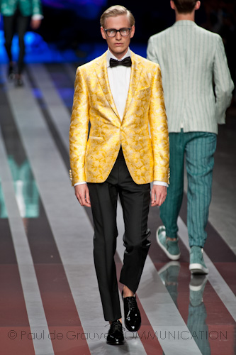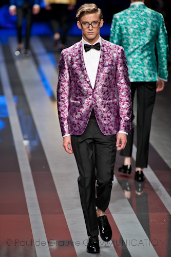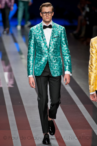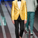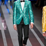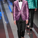 A sorpresa poi la sfilata si conclude con quattro uscite da grand soirée: pantalone nero, camicia bianca, papillon, occhiali da nerd e giacche monopetto dalle stampe cangianti in colori squillanti, per non perdere mai l’idea di gioco data dalle numerose citazioni ironiche.